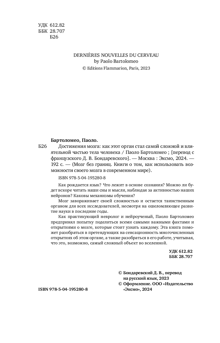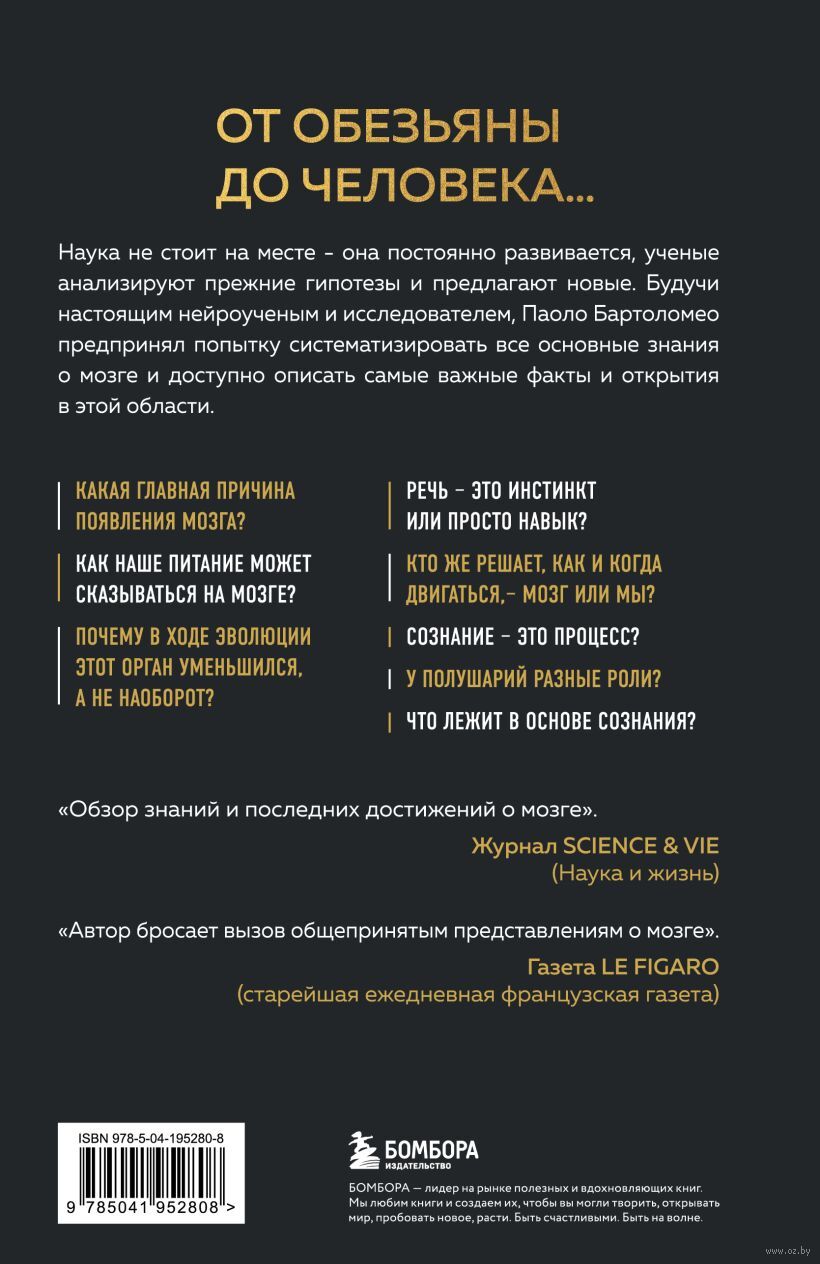 Как практикующий врач-нейролог и нейроученый, Паоло Бартоломео, предпринял попытку поделиться всеми самыми важными фактами и открытиями о мозге, которые стоит узнать каждому. Эта книга поможет разобраться в претендующих на сенсационность многочисленных открытиях о об этом органе, а также разобраться в его работе, который претендует на роль самого сложного объекта во Вселенной.