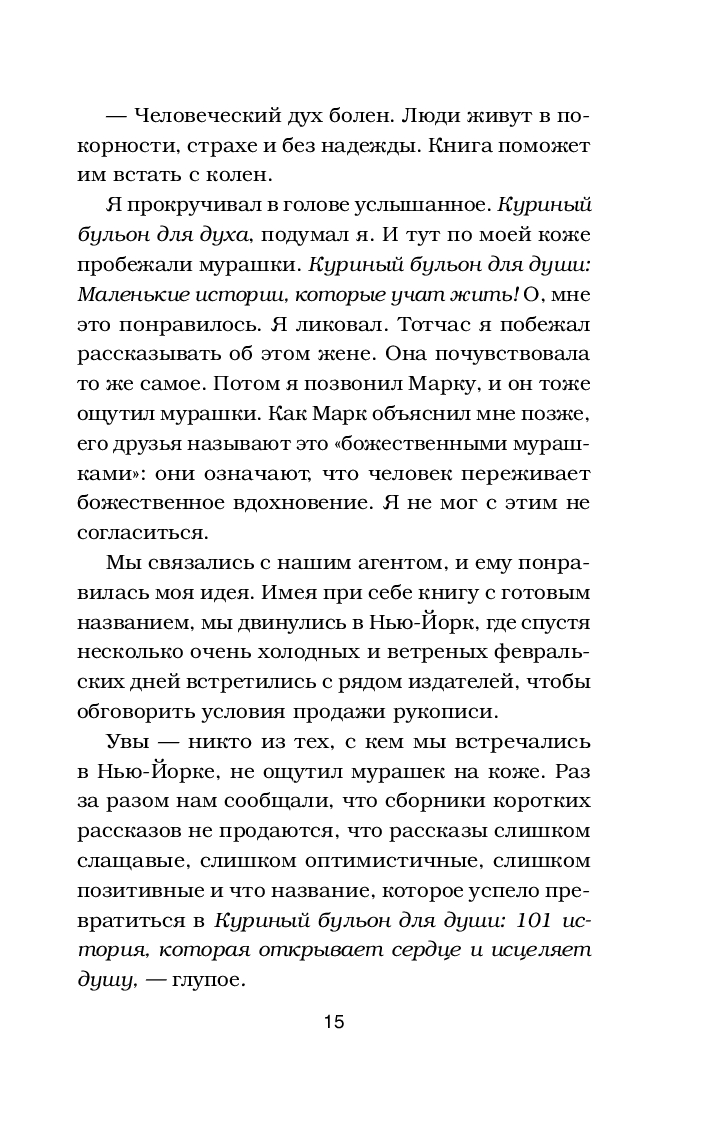 В детстве, когда вы болели, ваша бабушка давала вам куриный бульон. Сегодня питание и забота нужны вашей душе. Маленькие истории из "Куриного бульона" – исцелят душевные раны и укрепят дух, дадут вашим мечтам новые крылья и откроют секрет самого большого счастья – счастья делиться и любить.