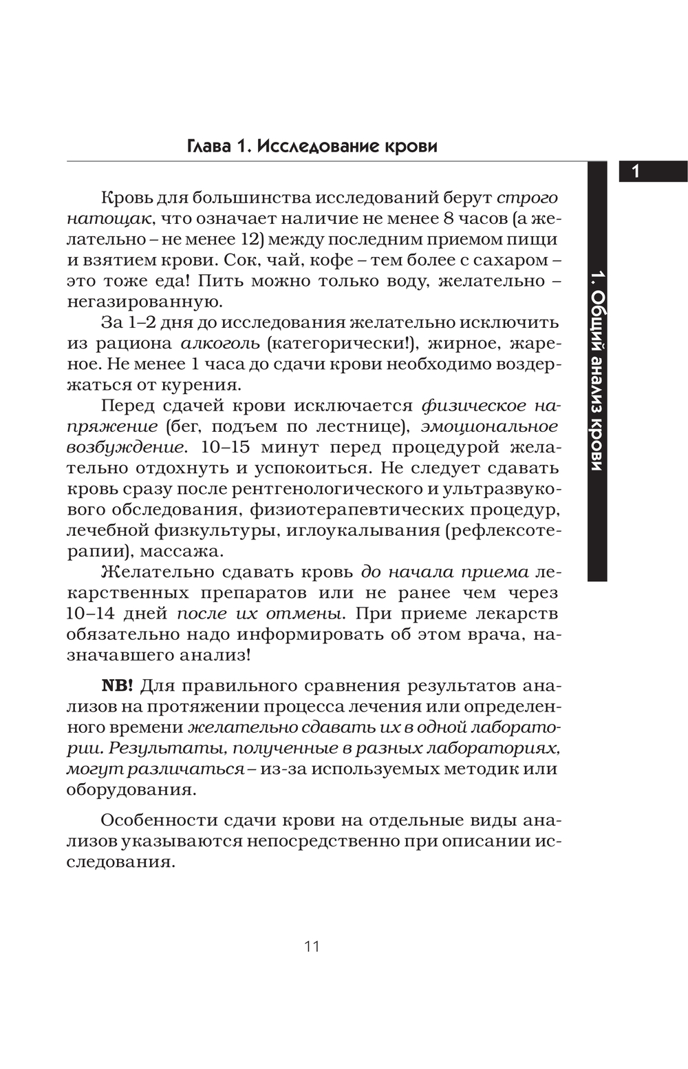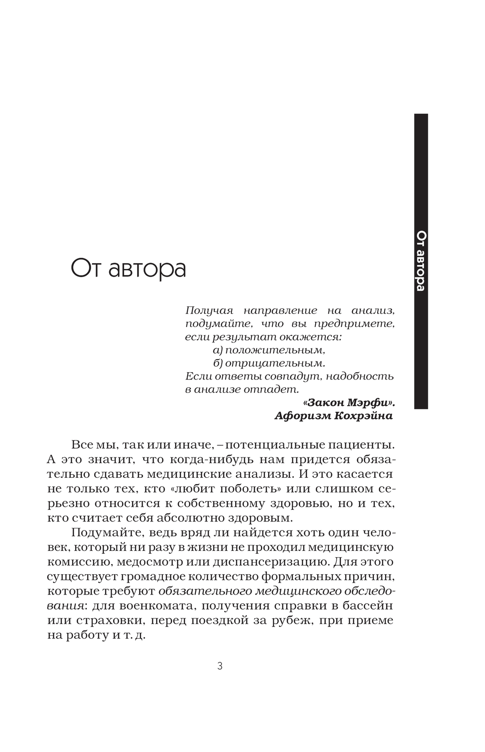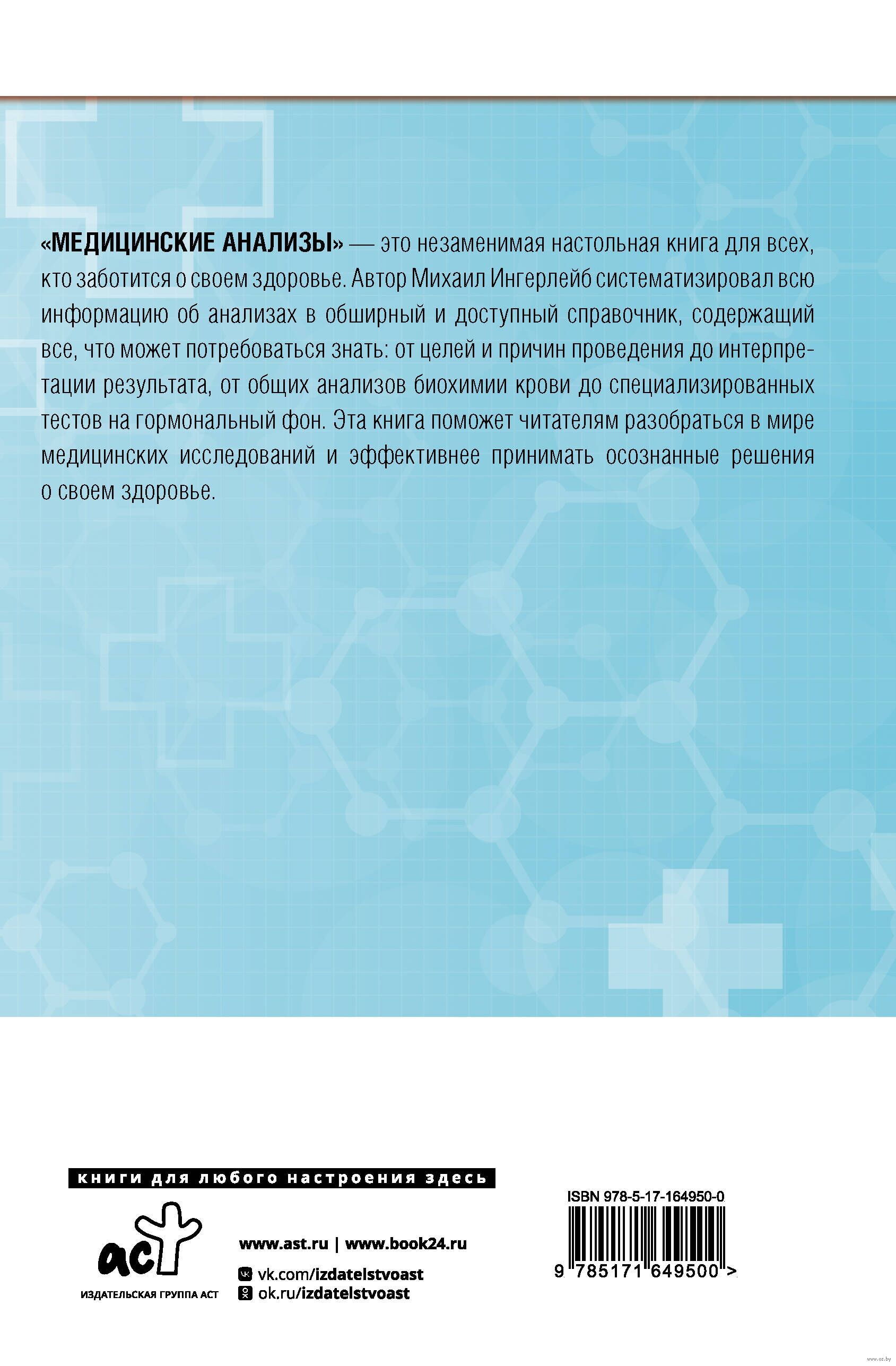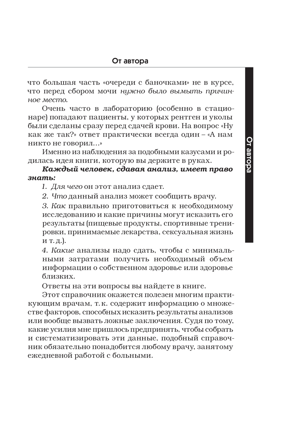 В предлагаемом справочнике представлены полные и современные сведения практически о всех медицинских анализах: общеклинических, биохимических, гормональных, иммунологических и многих других. Особое внимание уделено описанию причин изменения нормальных показателей, влиянию на эти изменения заболеваний, лекарств и даже ошибок при заборе анализа. Справочник отличается логичной и ясной для использования логической структурой, развитой системой алфавитных указателей, удобным поиском данных. Книга рекомендуется как для людей без медицинского образования, так и для врачей и других медицинских работников.