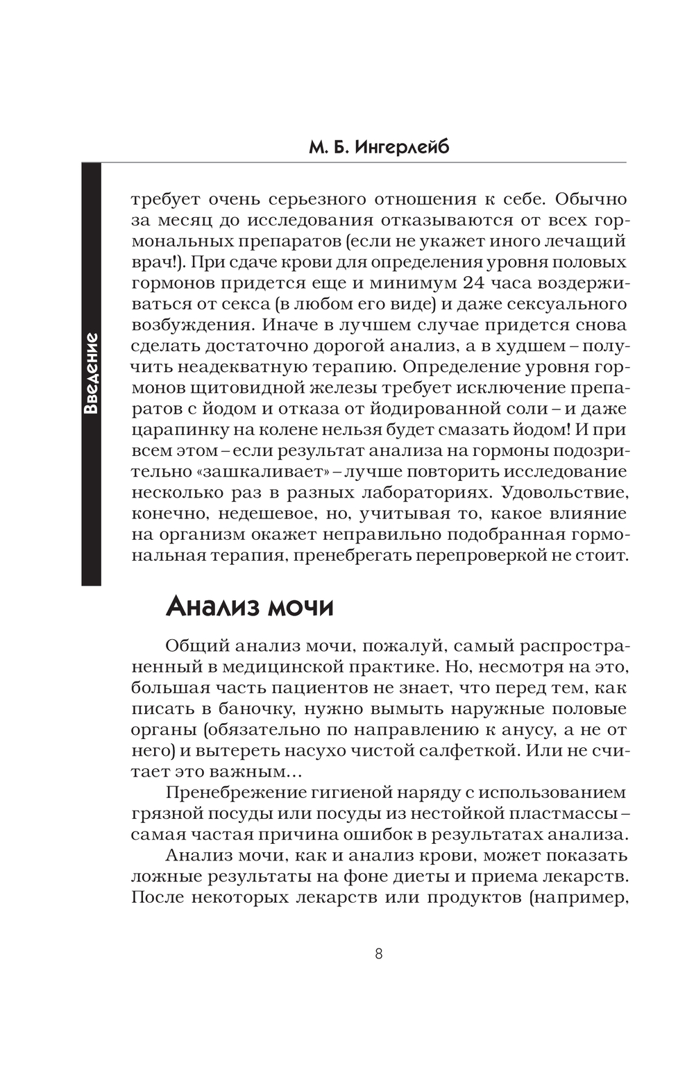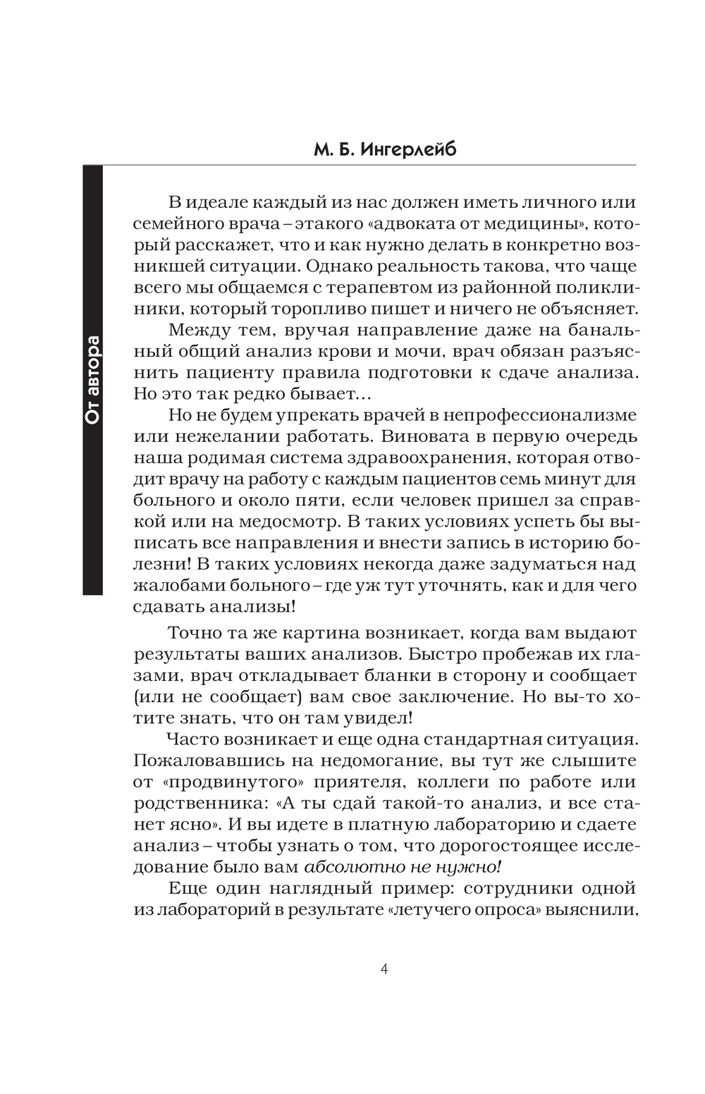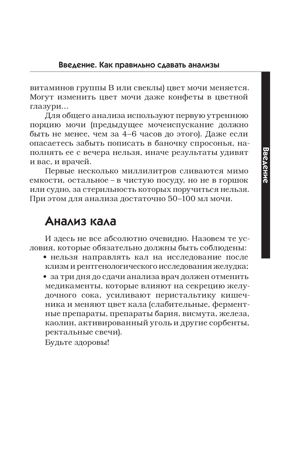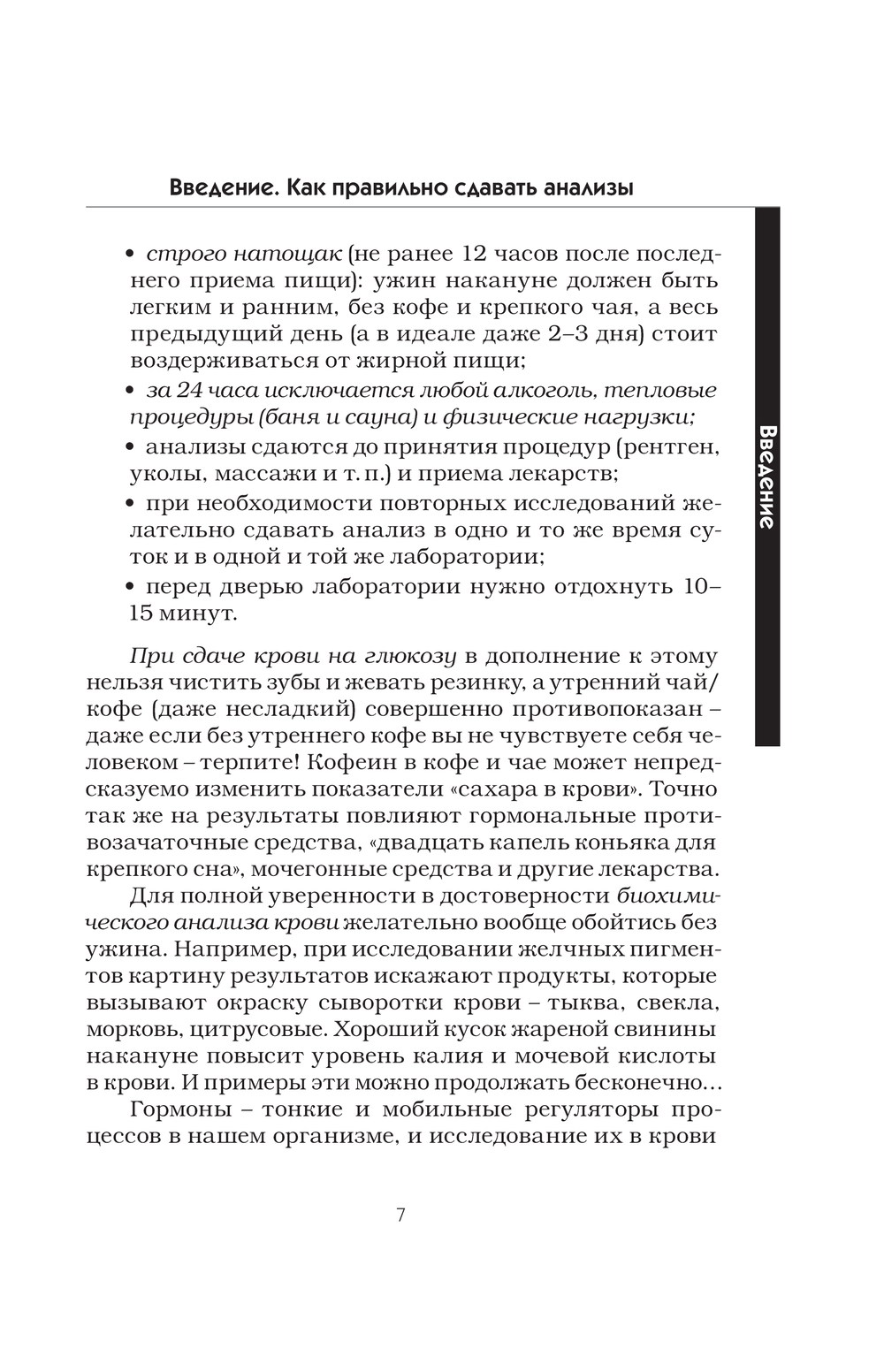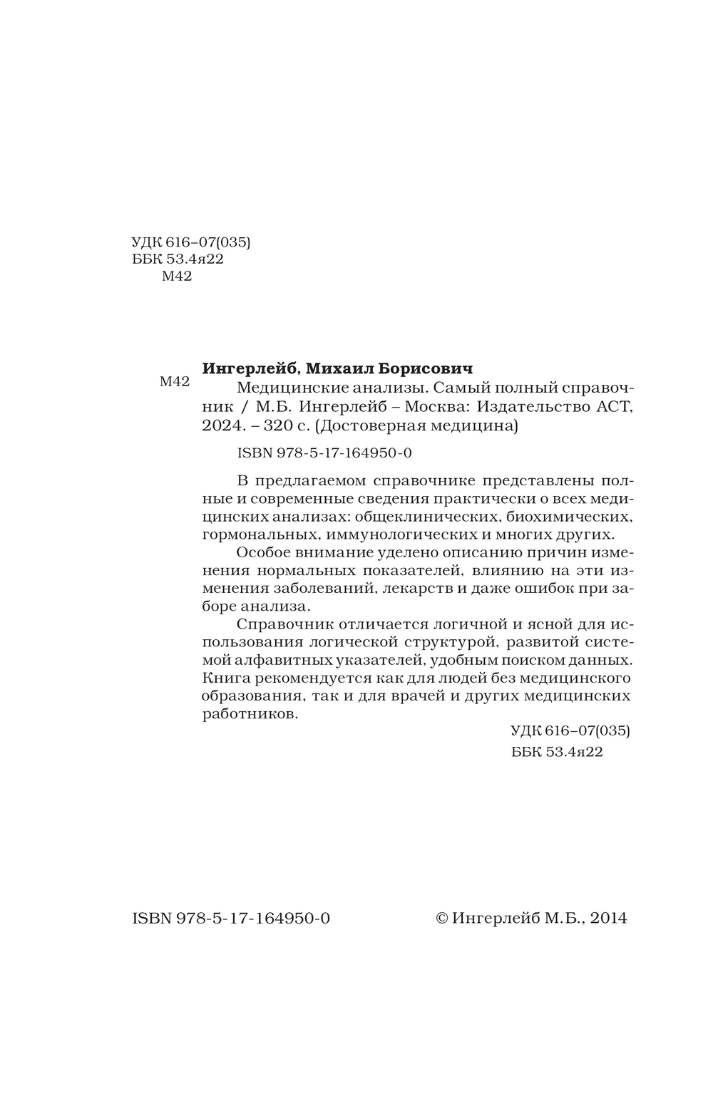 В предлагаемом справочнике представлены полные и современные сведения практически о всех медицинских анализах: общеклинических, биохимических, гормональных, иммунологических и многих других. Особое внимание уделено описанию причин изменения нормальных показателей, влиянию на эти изменения заболеваний, лекарств и даже ошибок при заборе анализа. Справочник отличается логичной и ясной для использования логической структурой, развитой системой алфавитных указателей, удобным поиском данных. Книга рекомендуется как для людей без медицинского образования, так и для врачей и других медицинских работников.