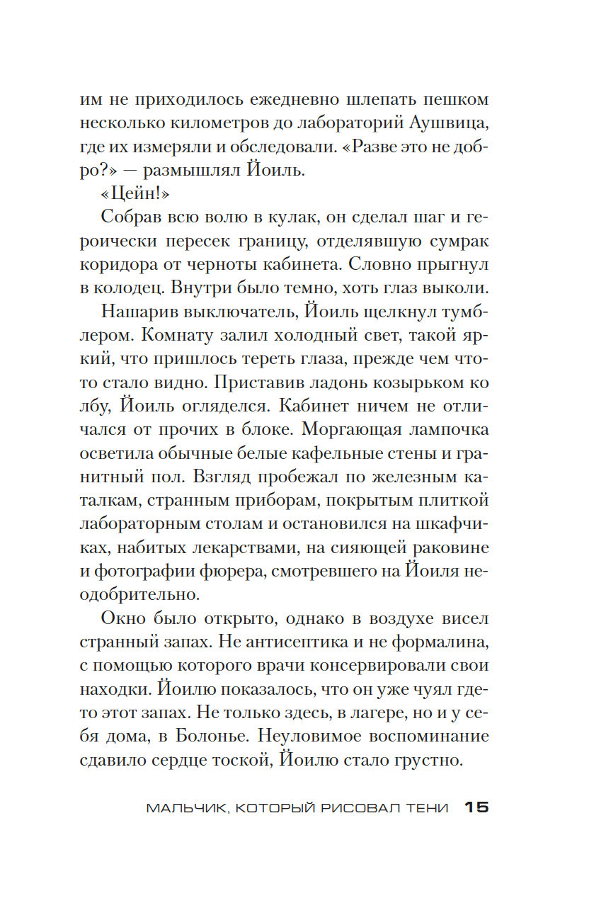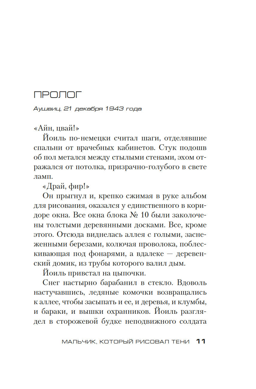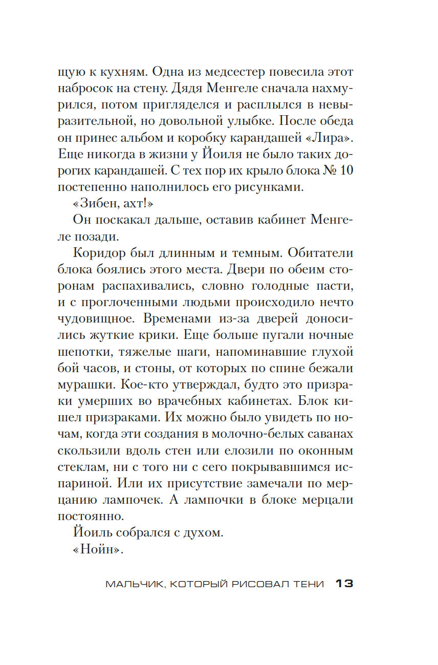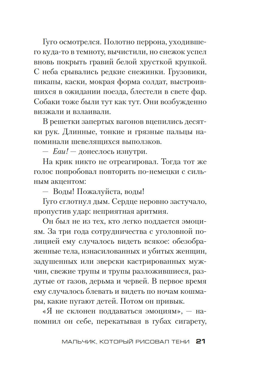 Ориана Рамунно написала детективный триллер на материале своих исследований Холокоста – невероятный, однако блестяще удавшийся ход. "Мальчик, который рисовал тени" – это "Мальчик в полосатой пижаме", если бы его написал Жан-Кристоф Гранже: напряженная детективная интрига, достоверный исторический фон, банальность зла и возможность противиться ему в тех краях, откуда давным-давно ушла надежда. Рамунно черпала материал в том числе из биографии своего двоюродного деда, побывавшего в лагере смерти и запомнившего, что даже в этом аду, даже среди надзирателей находились люди, которым хватало духу оставаться людьми и сопротивляться.