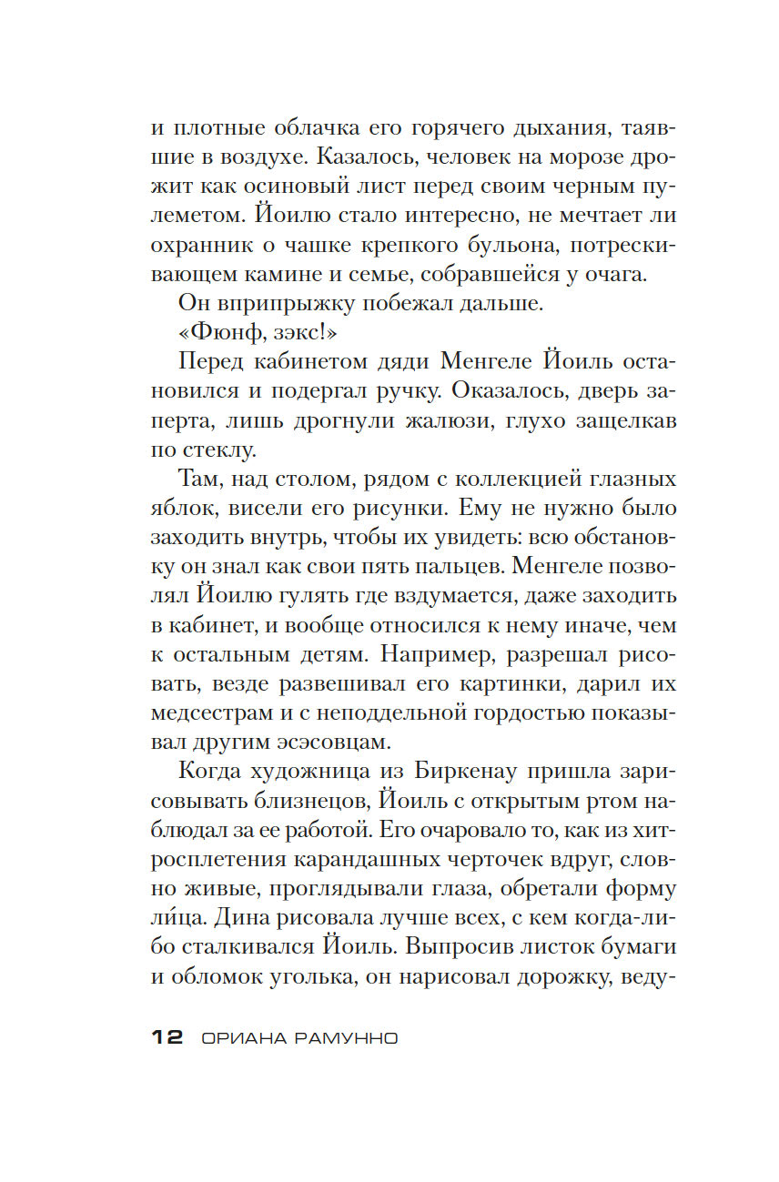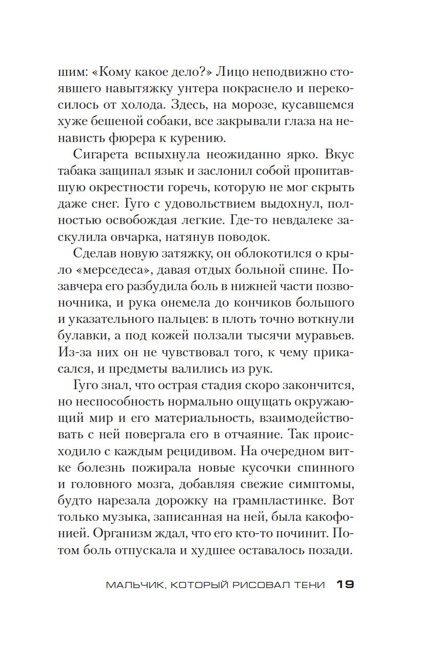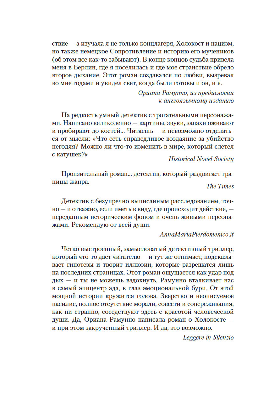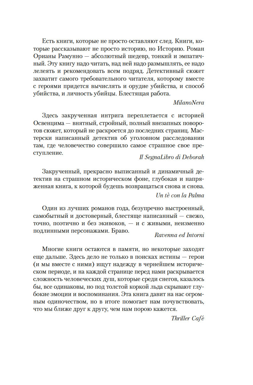 Ориана Рамунно написала детективный триллер на материале своих исследований Холокоста – невероятный, однако блестяще удавшийся ход. "Мальчик, который рисовал тени" – это "Мальчик в полосатой пижаме", если бы его написал Жан-Кристоф Гранже: напряженная детективная интрига, достоверный исторический фон, банальность зла и возможность противиться ему в тех краях, откуда давным-давно ушла надежда. Рамунно черпала материал в том числе из биографии своего двоюродного деда, побывавшего в лагере смерти и запомнившего, что даже в этом аду, даже среди надзирателей находились люди, которым хватало духу оставаться людьми и сопротивляться.