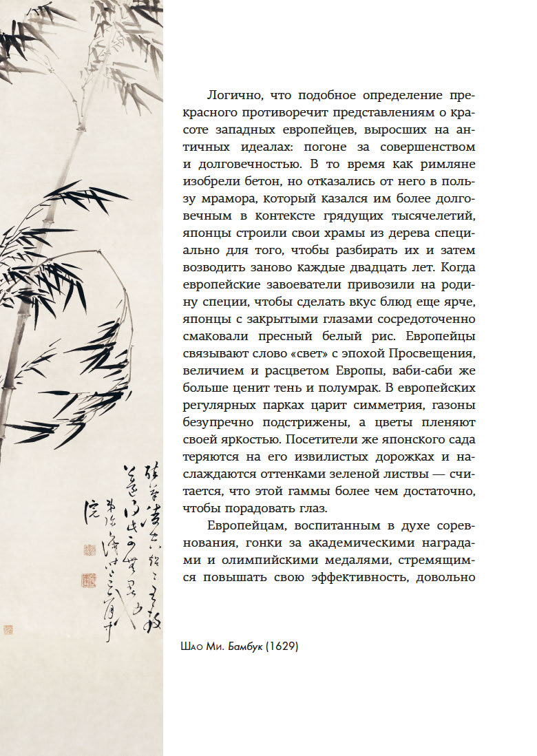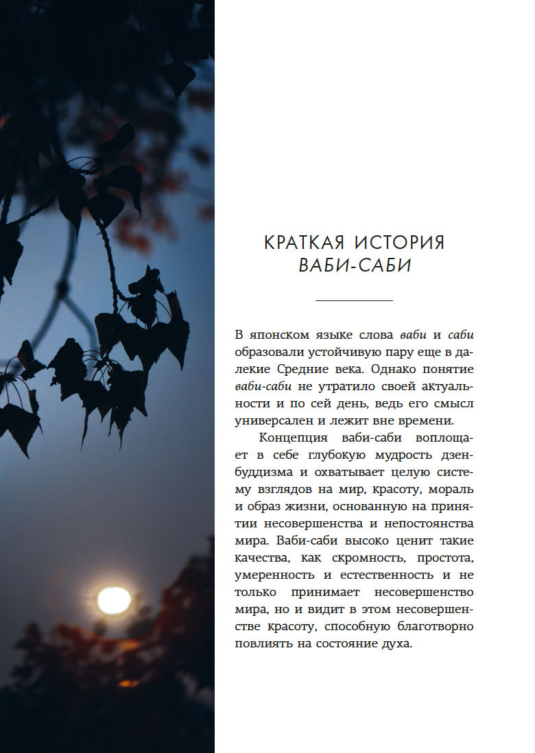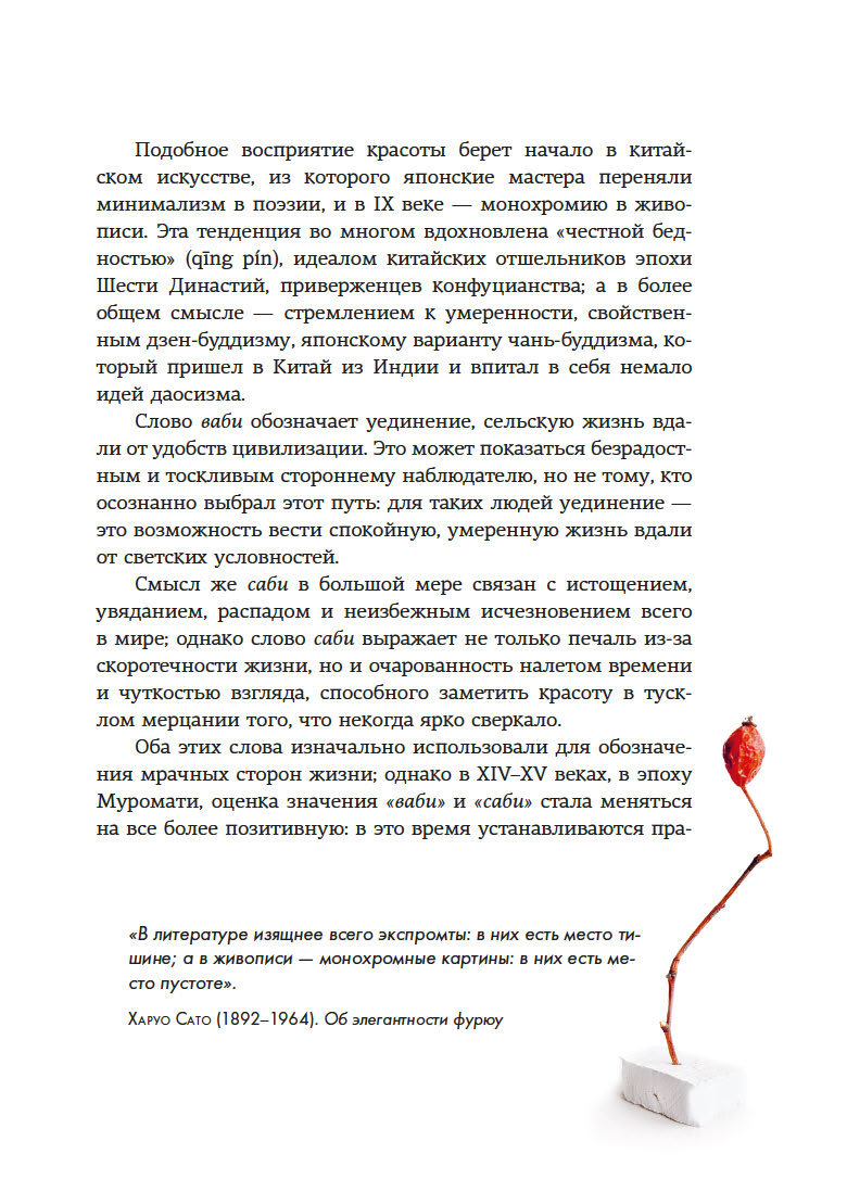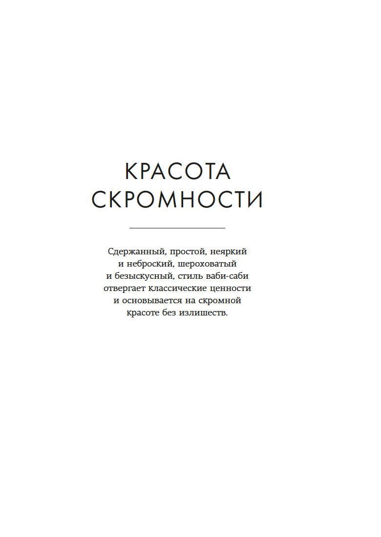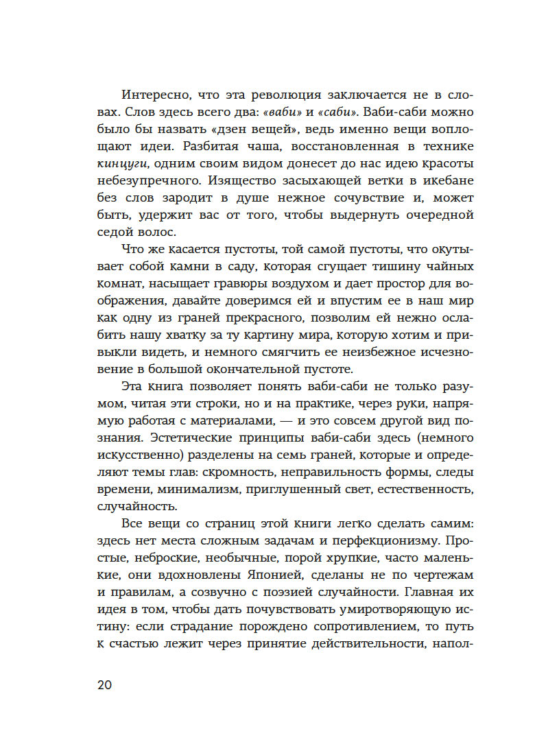 Отдохните душой в прохладной тени идей, изложенных на страницах этой книги, чтобы сделать глоток свежего воздуха в душном мире соперничества, расчета, приобретательства, гонки за достижениями. Оцените прелесть минимализма и сдержанности, неправильных форм и незавершенности, чтобы сделать первый шаг на пути к принятию несовершенства всего сущего и осознанию величия бесконечности.