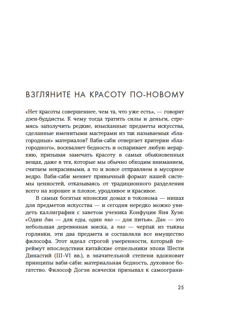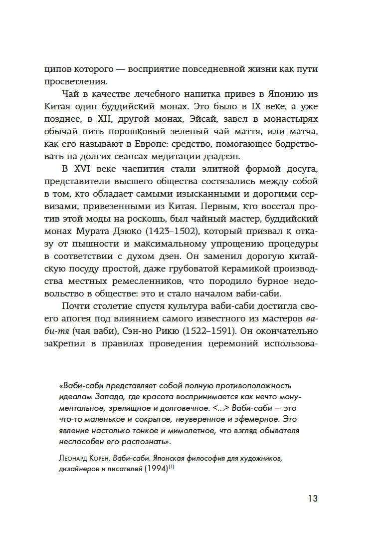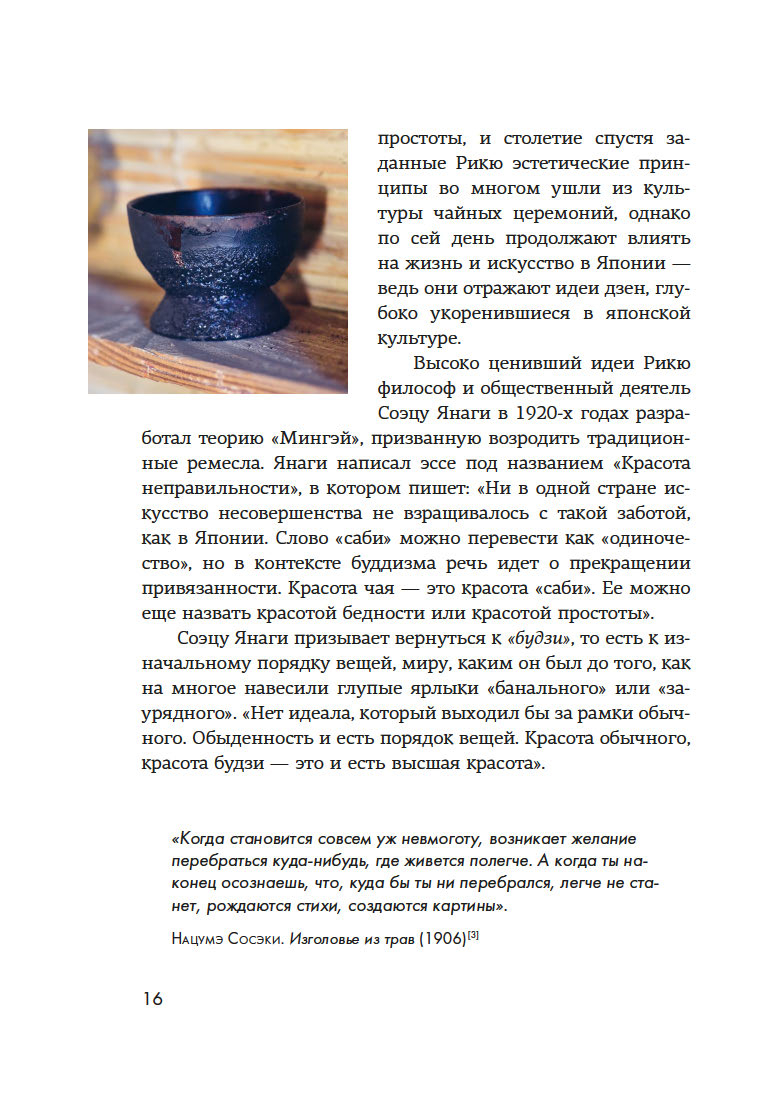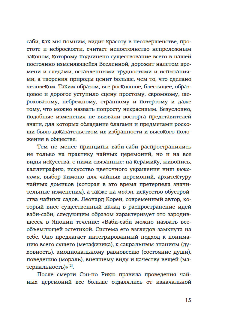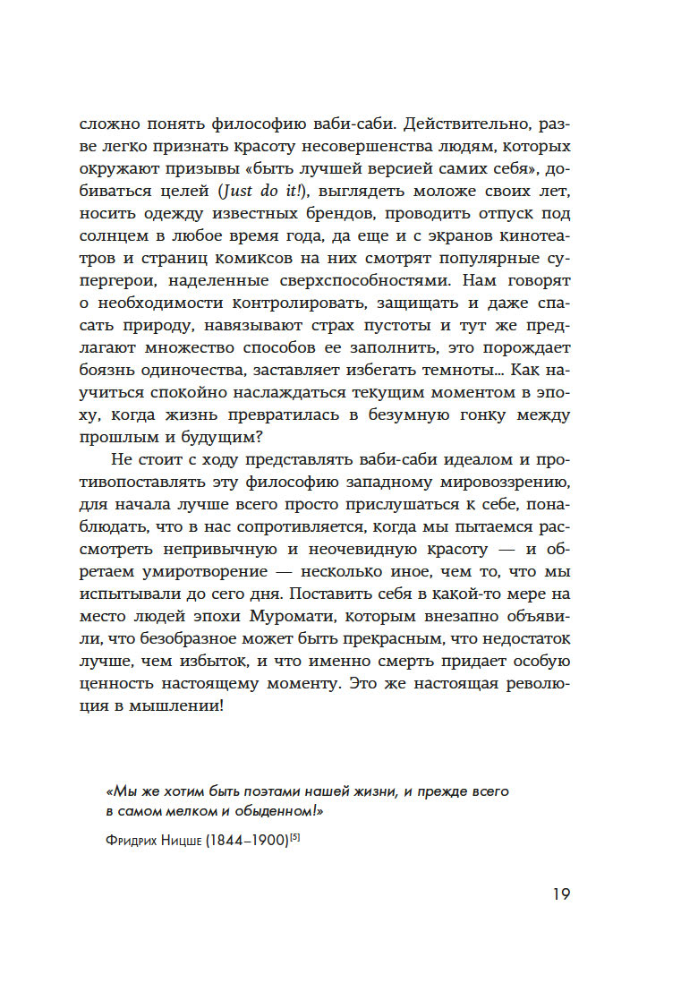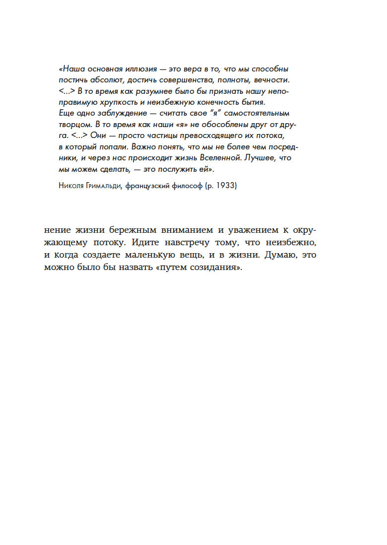Отдохните душой в прохладной тени идей, изложенных на страницах этой книги, чтобы сделать глоток свежего воздуха в душном мире соперничества, расчета, приобретательства, гонки за достижениями. Оцените прелесть минимализма и сдержанности, неправильных форм и незавершенности, чтобы сделать первый шаг на пути к принятию несовершенства всего сущего и осознанию величия бесконечности.
