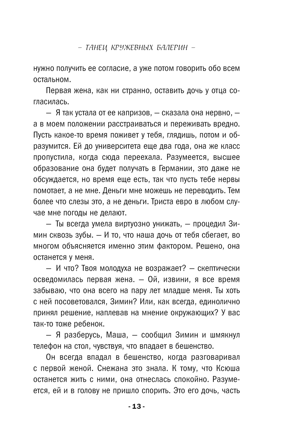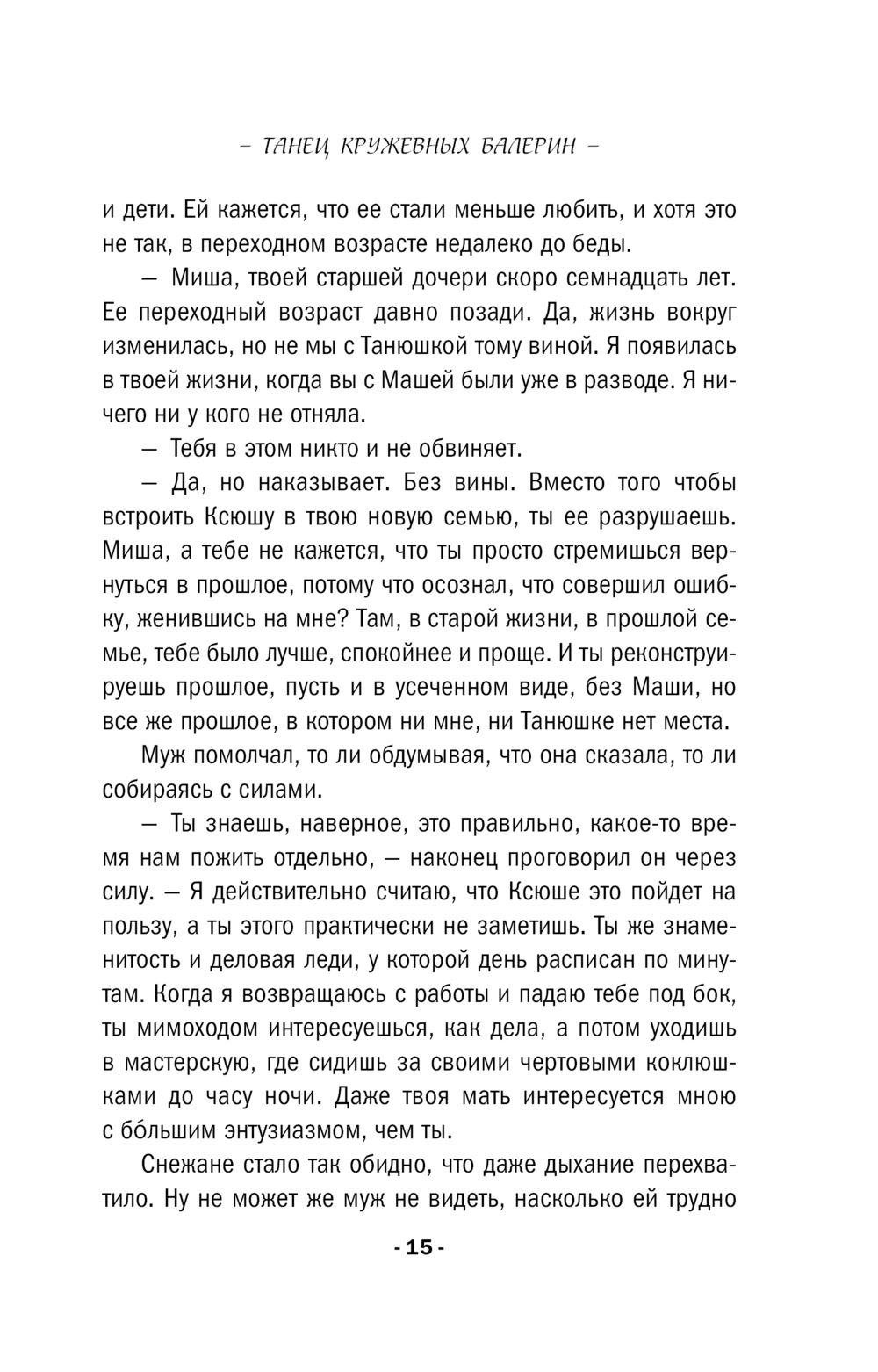У главной героини нового романа Людмилы Мартовой "Танец кружевных балерин" Снежаны Машковской прибавилось забот: помимо подготовки к выставке, маленький ребенок и любимый муж следователь Зимин не дают заскучать за плетением кружев. А тут еще таинственная смерть соседки, которая оказывается убийством. И следы, как узнает Снежана, ведут в прошлое...