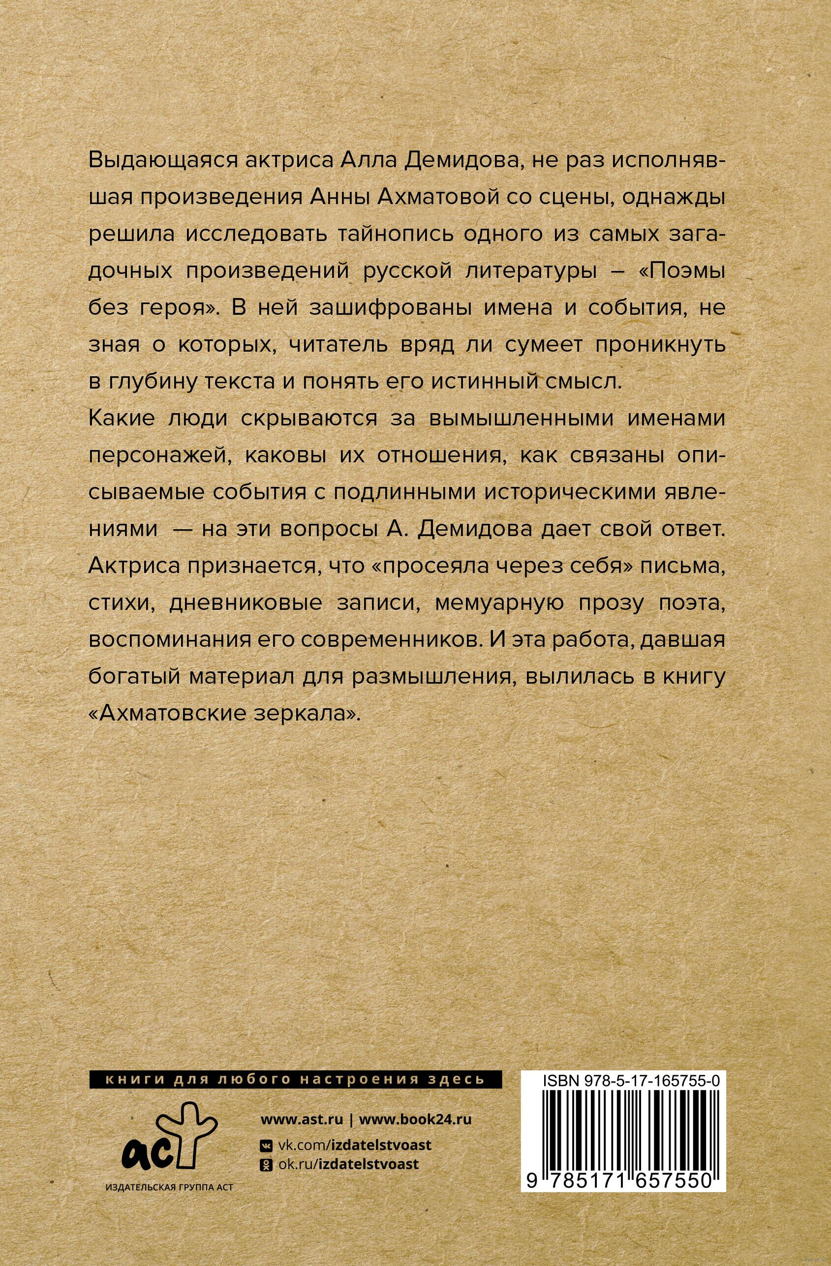 Какие люди скрываются за вымышленными именами персонажей, каковы их отношения, как связаны описываемые события с подлинными историческими явлениями – на эти вопросы А. Демидова дает свой ответ. Актриса признается, что "просеяла через себя" письма, стихи, дневниковые записи, мемуарную прозу поэта, воспоминания его современников. И эта работа, давшая богатый материал для размышления, вылилась в книгу "Ахматовские зеркала".