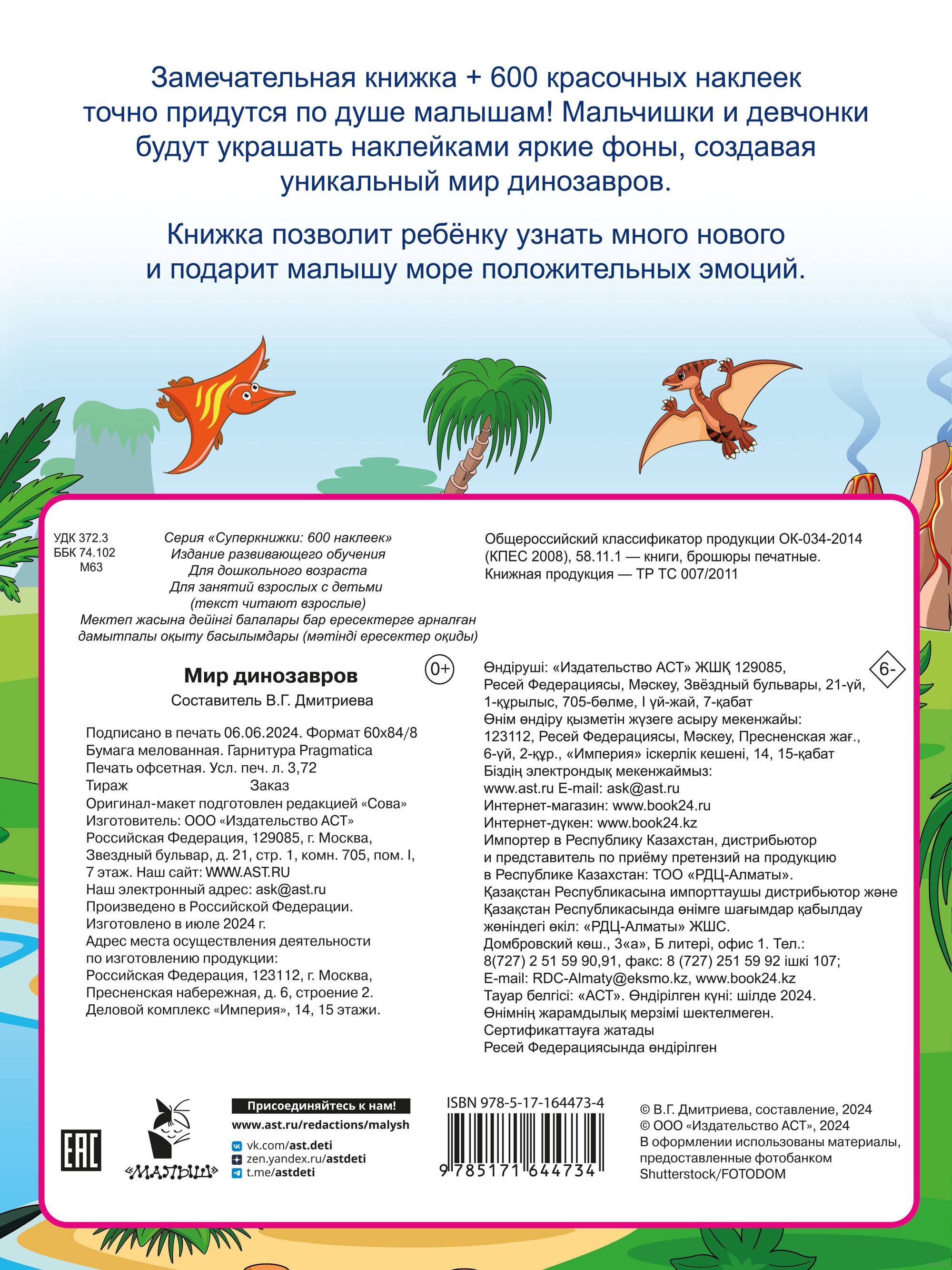"Мир динозавров" – это креативная и забавная книга с наклейками для ребёнка. В ней 600 качественных наклеек с изображением динозавров, которые малыш может располагать по своему усмотрению на красочных фонах. Ребёнок познакомится с динозаврами, которые живут в воде, на суше и летают в небе. Это отличный способ провести время не только весело, но и с пользой.