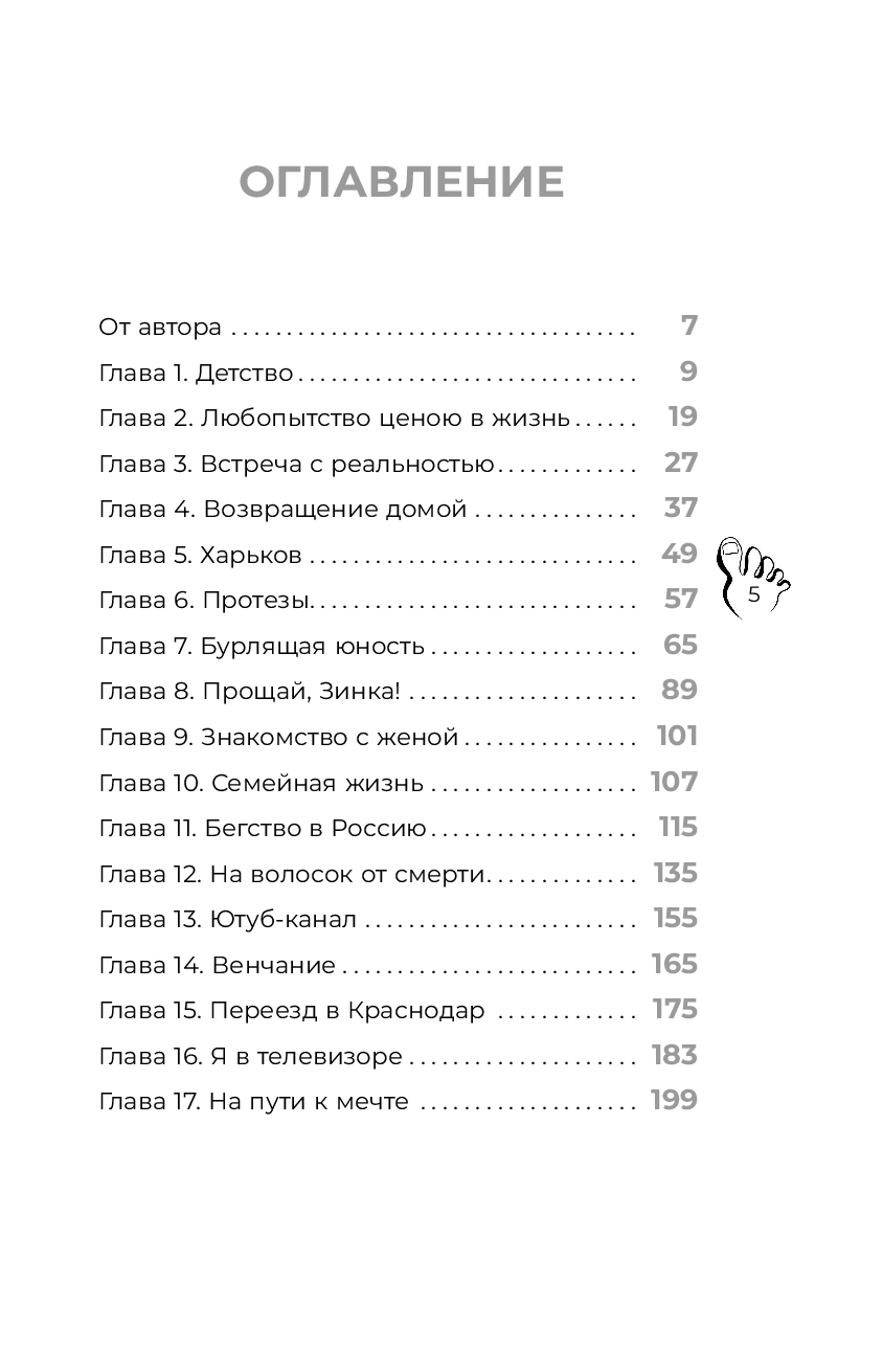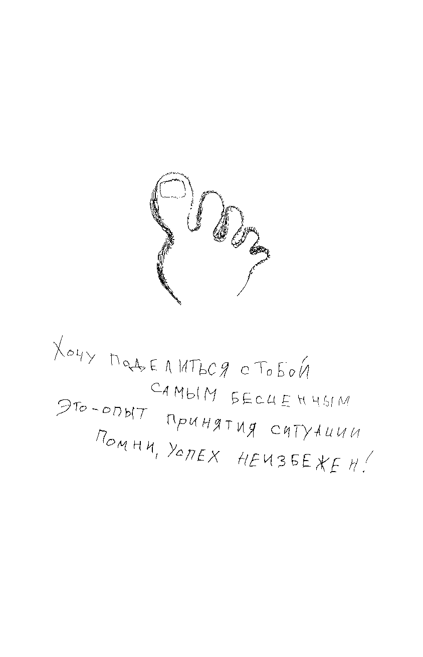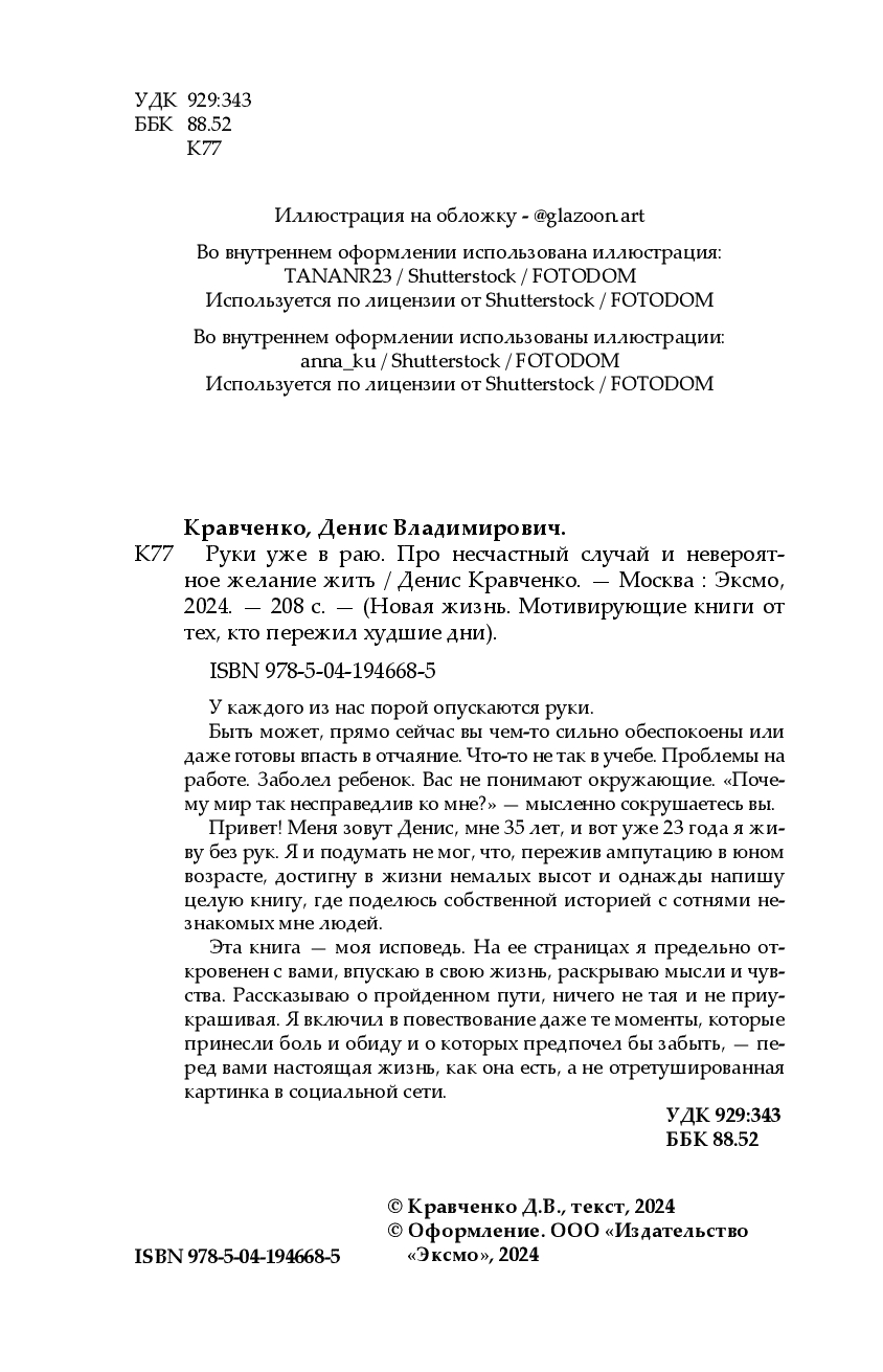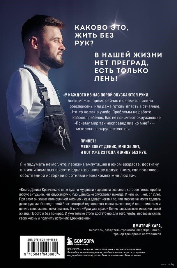 "Книга Дениса Кравченко о силе духа, о мудрости и зрелости сознания, которое готово пройти любую ситуацию, "не опуская рук". Руки Дениса не опускаются никогда. У него их... нет, с 12 лет. При этом он живет полноценной жизнью и сам делает ногами то, что многие не могут сделать даже руками. Он ведет свой блог, который вдохновляет сотни тысяч людей не отчаиваться и ценить свою жизнь, пока она есть.