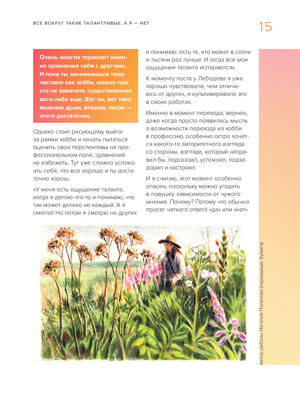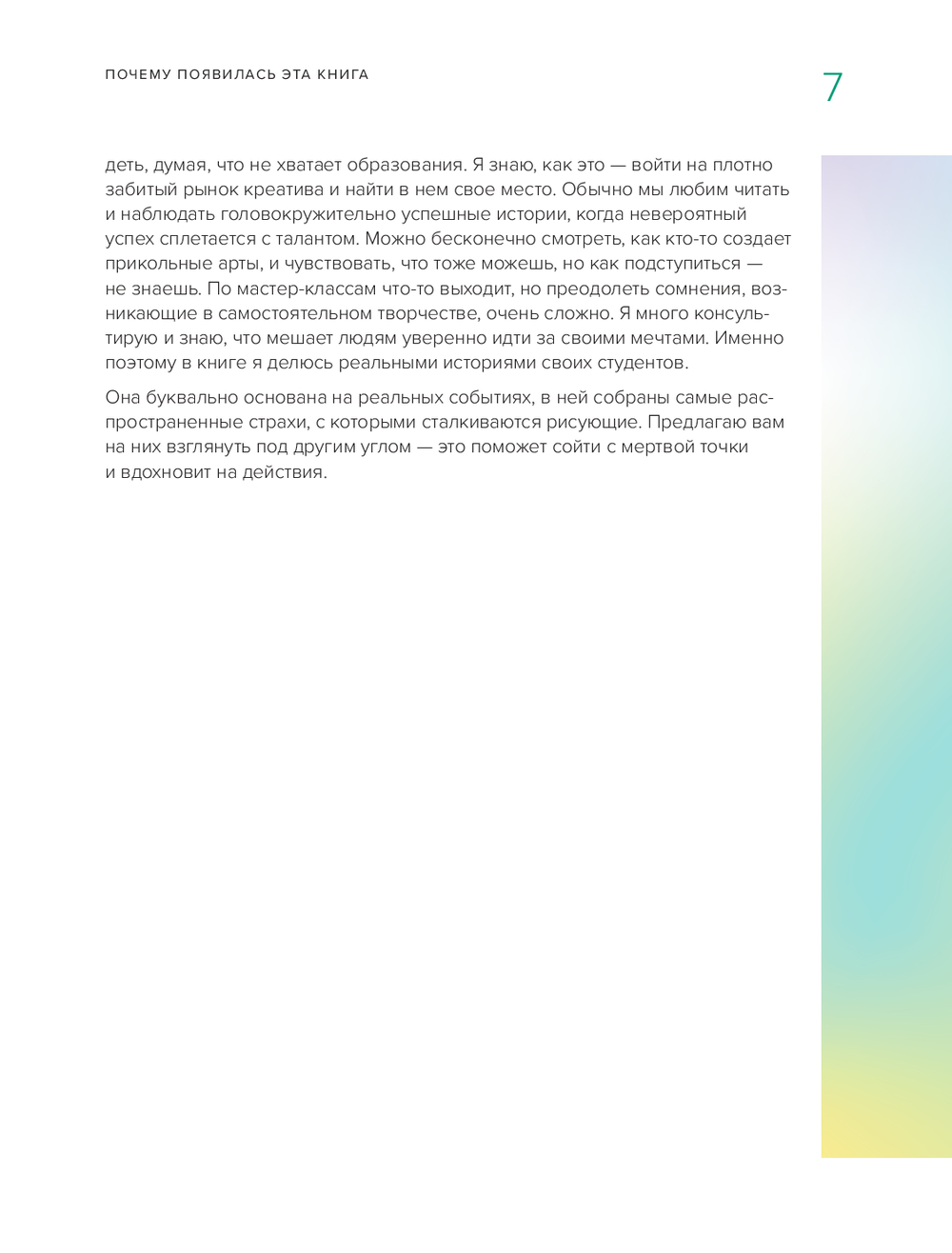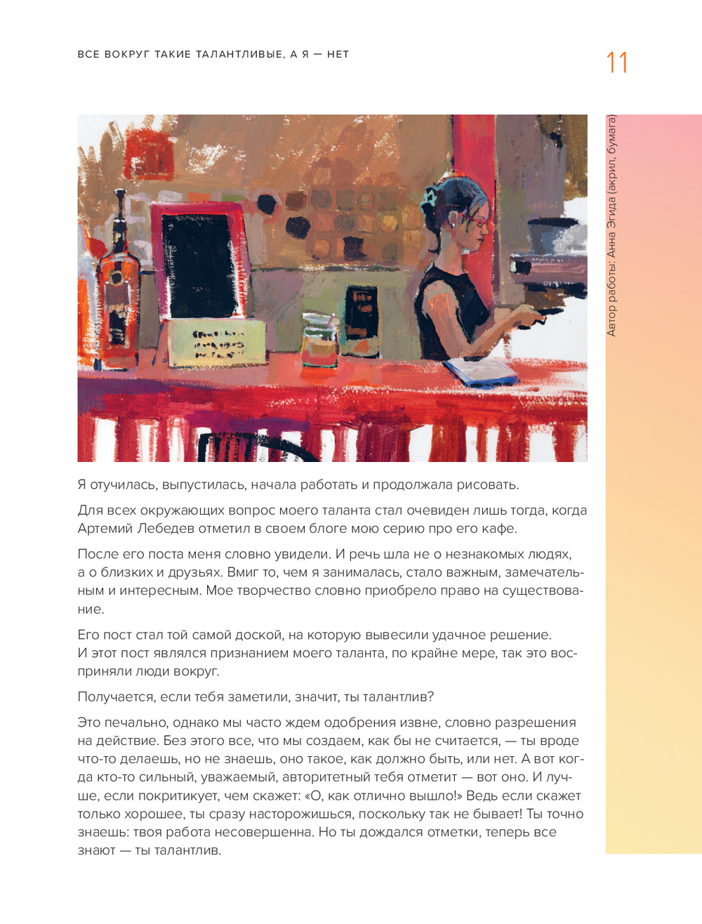 Когда нужно начать рисовать? С чего начать? Важно ли художественное образование? Как получать отдачу от творчества? Эта книга ответит на все эти и другие ваши вопросы. В ней профессиональная художница Анна Эгида подробно разберет страхи новичков и художников-любителей, на простых упражнениях покажет, как сделать первые шаги в сторону реализации своей мечты, научит через рисование видеть потенциал в любом деле и наконец начать зарабатывать, занимаясь тем, что любишь! Благодаря наглядным примерам из личного опыта и разным заданиям вы сможете преодолеть все свои страхи, собрать собственное портфолио и получить первый заказ! Этот путеводитель – отличный подарок для всех, кто давно любит заниматься творчеством и хочет зарабатывать на нем.
