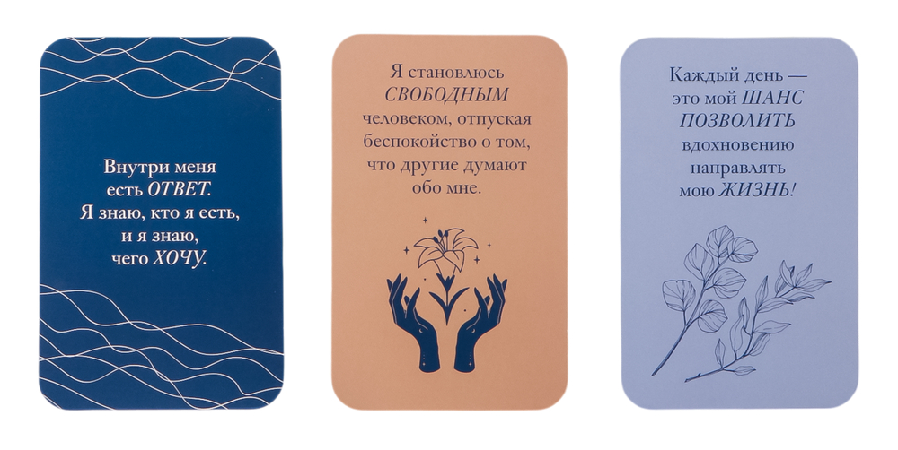 Аффирмации, написанные на каждой карте этой колоды, настроят на спокойствие и уверенность в своих силах, а минималистичное оформление позволит разуму воспринять аффирмацию глубже.