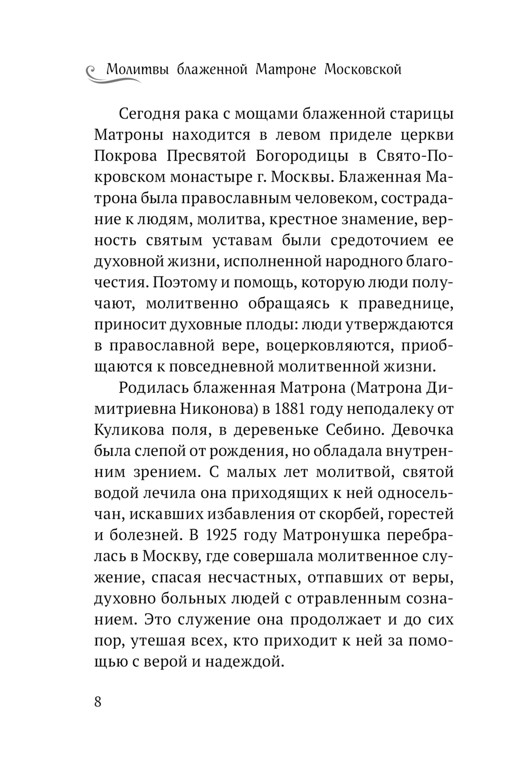 Сборник уникальных молитв к Блаженной Матроне Московской, почитаемой всеми православными людьми, с описанием ее жизни и духовных подвигов.