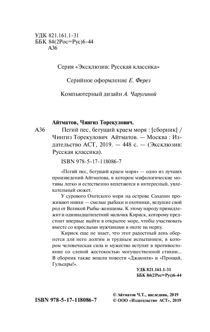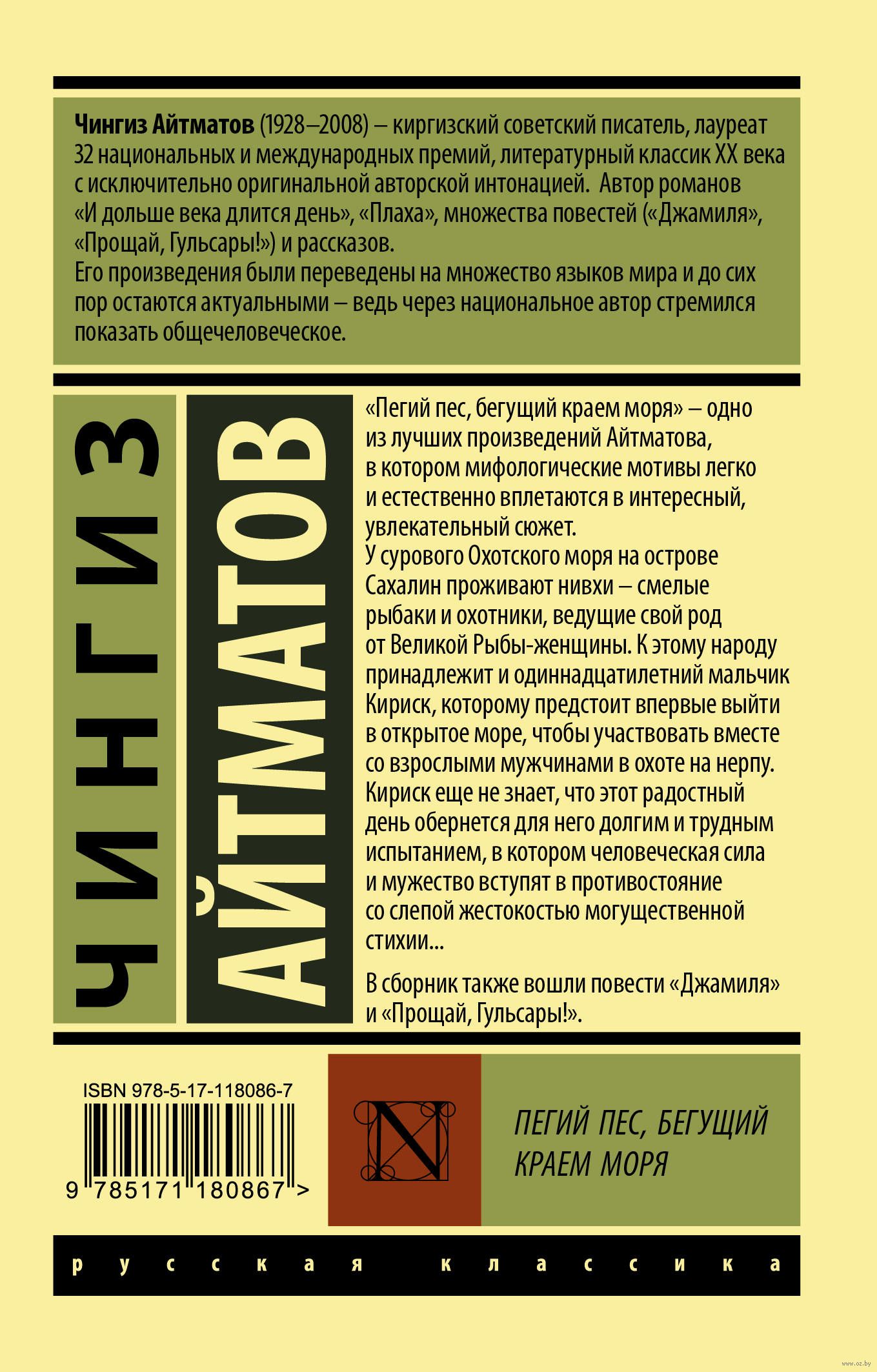 "Пегий пес, бегущий краем моря" – одно из лучших произведений Айтматова, в котором мифологические мотивы легко и естественно вплетаются в интересный, увлекательный сюжет. У сурового Охотского моря на острове Сахалин проживают нивхи – смелые рыбаки и охотники, ведущие свой род от Великой Рыбы-женщины.
