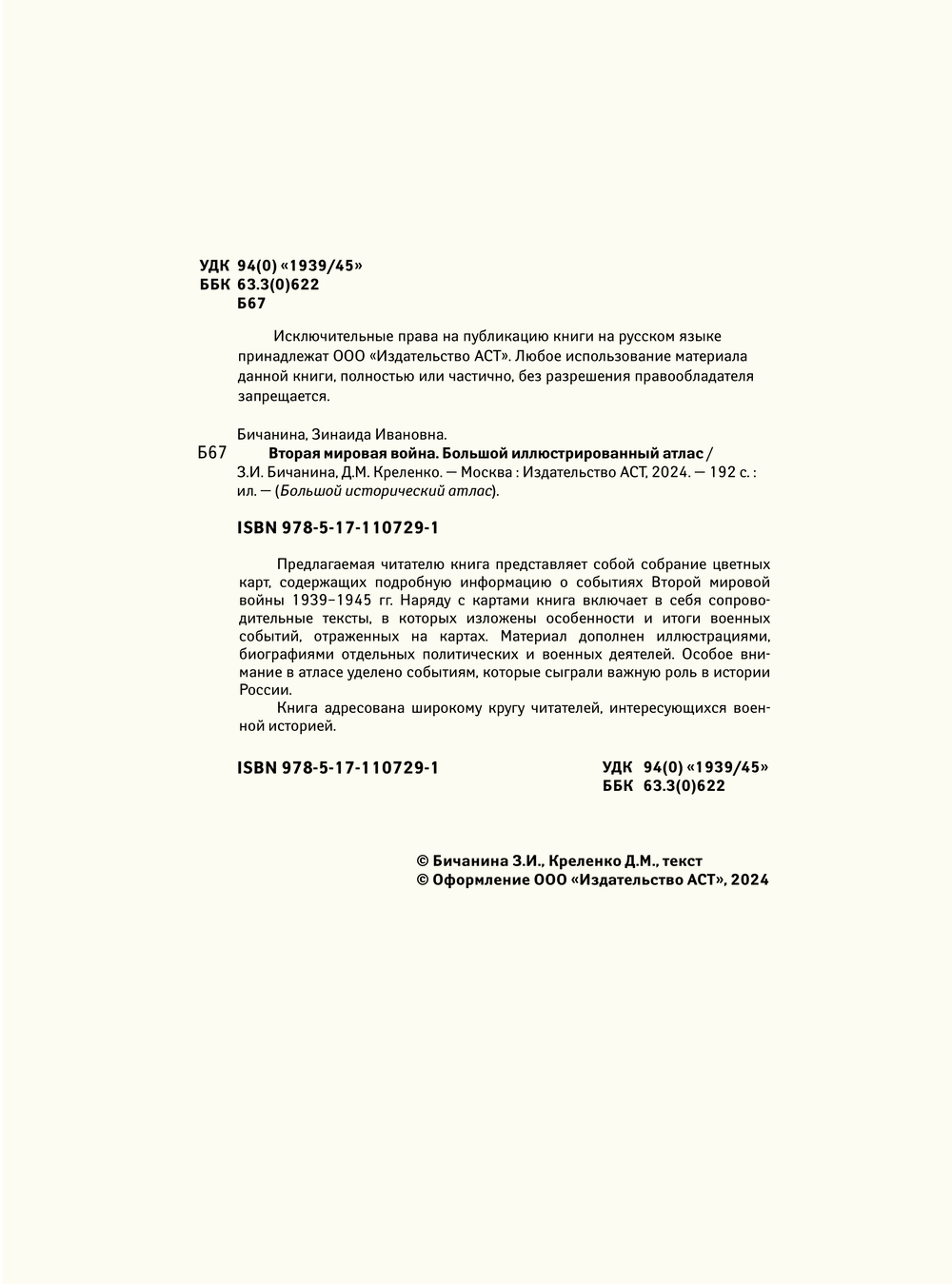 Предлагаемая читателю книга представляет собой собрание цветных карт, содержащих подробную информацию о событиях Второй мировой войны 1939-1945 гг. Наряду с картами книга включает в себя сопроводительные тексты, в которых изложены особенности и итоги военных событий, отраженных на картах. Материал дополнен иллюстрациями, биографиями отдельных политических и военных деятелей. Особое внимание в атласе уделено событиям, которые сыграли важную роль в истории России.