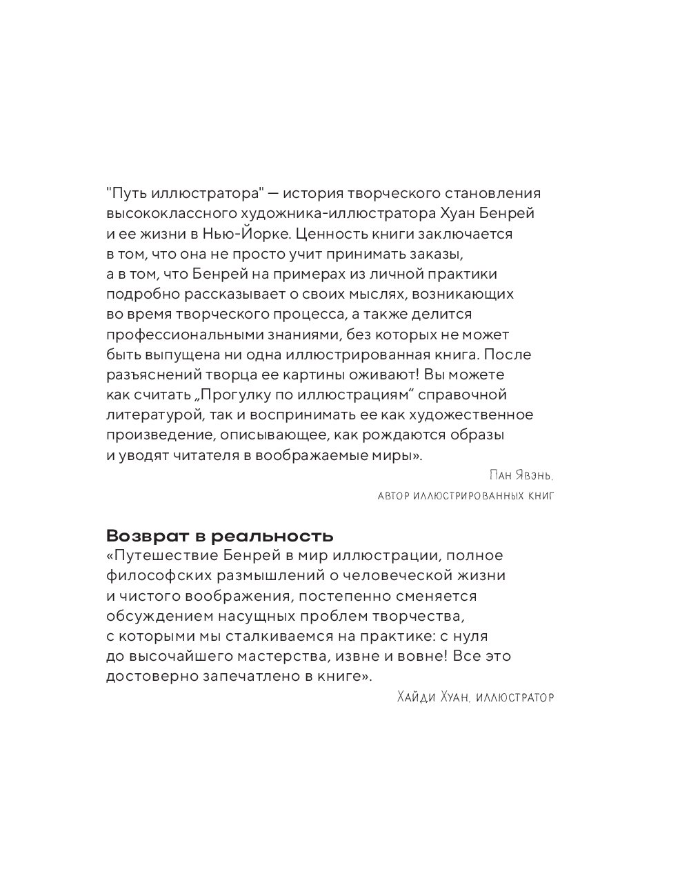 Книги не устаревают для детей, они устаревают только для взрослых. Но хорошая книга всегда может вернуть каждого в атмосферу детства. На страницах этого пособия вы отправитесь на прогулку по миру книжной иллюстрации вместе с тайванской художницей Хуан Бенрей. Вы узнаете, в чем смысл "книжек с картинками", как нужно с ними работать и как создавать для них цепляющие взгляд рисунки, а также как найти своего издателя и выпустить собственную книгу. Автор поделится подробным описанием рабочего процесса и даст важные советы, которые пригодятся любому художнику.
