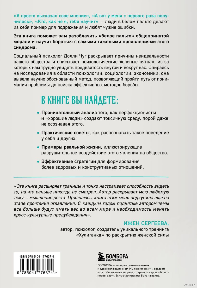 "Я просто высказал свое мнение", "А вот у меня с первого раза получилось", "Кто, как не я, тебя научит" – люди в белом пальто делают из себя пример для подражания и любят чужие ошибки. Эта книга поможет вам разоблачить "белое пальто" общепринятой морали и научит бороться с самыми тяжелыми проявлениями этого синдрома.