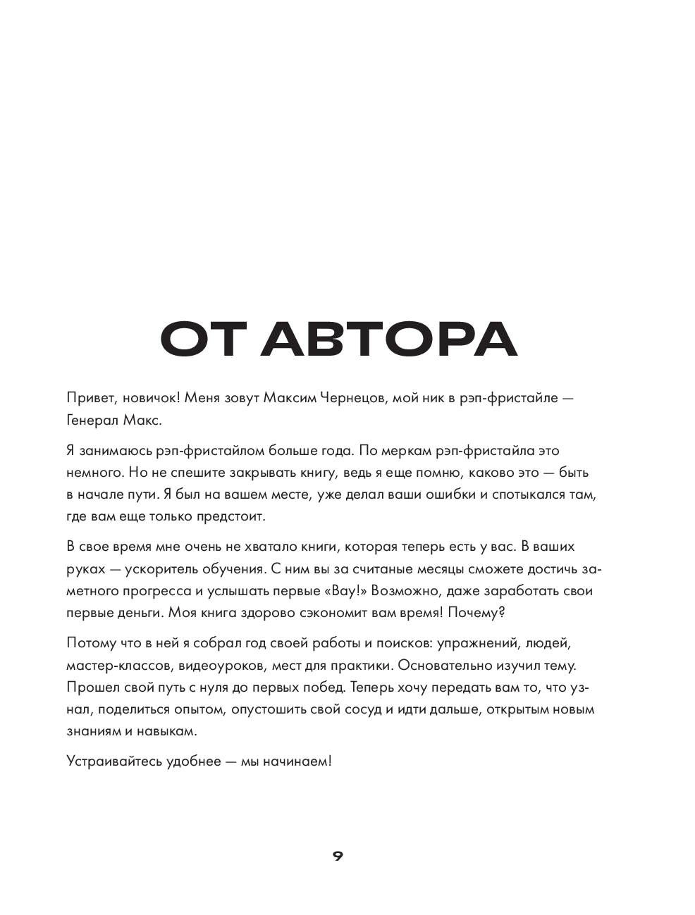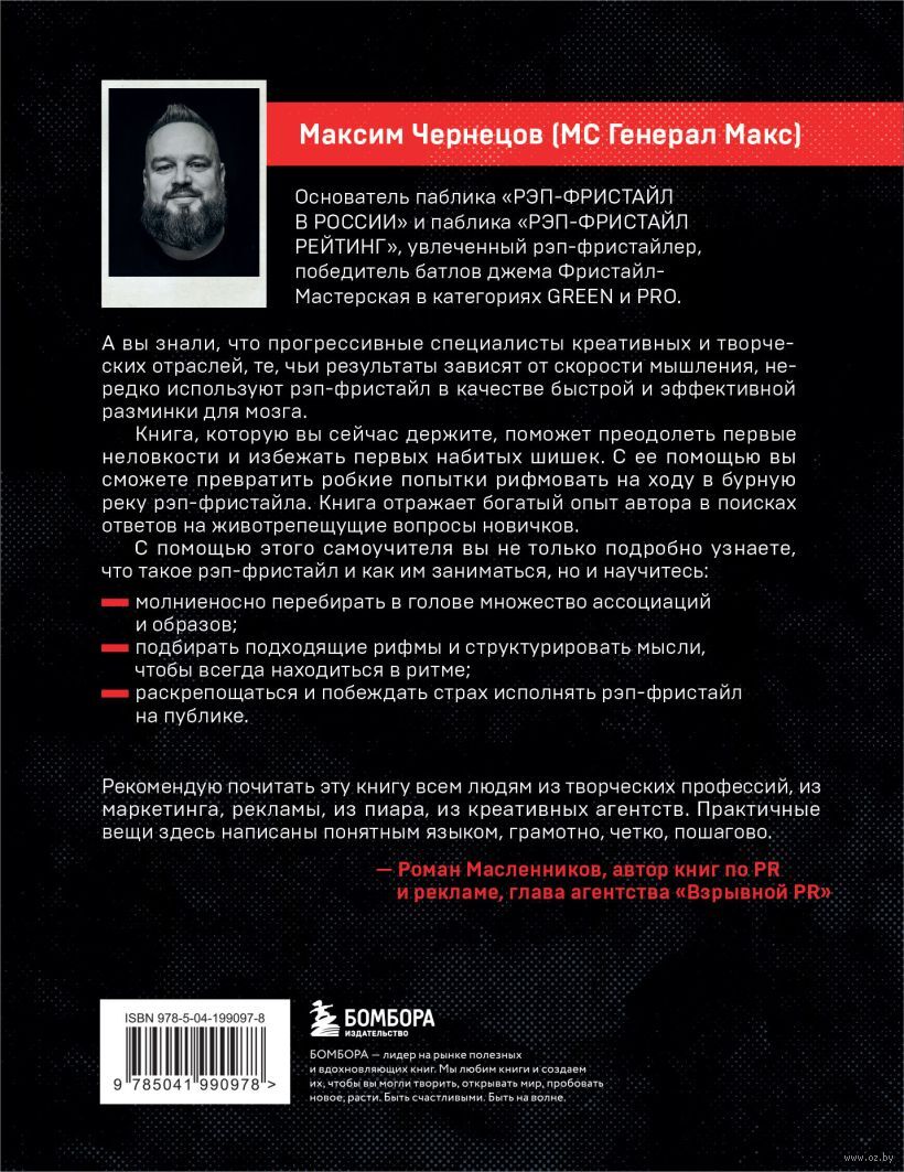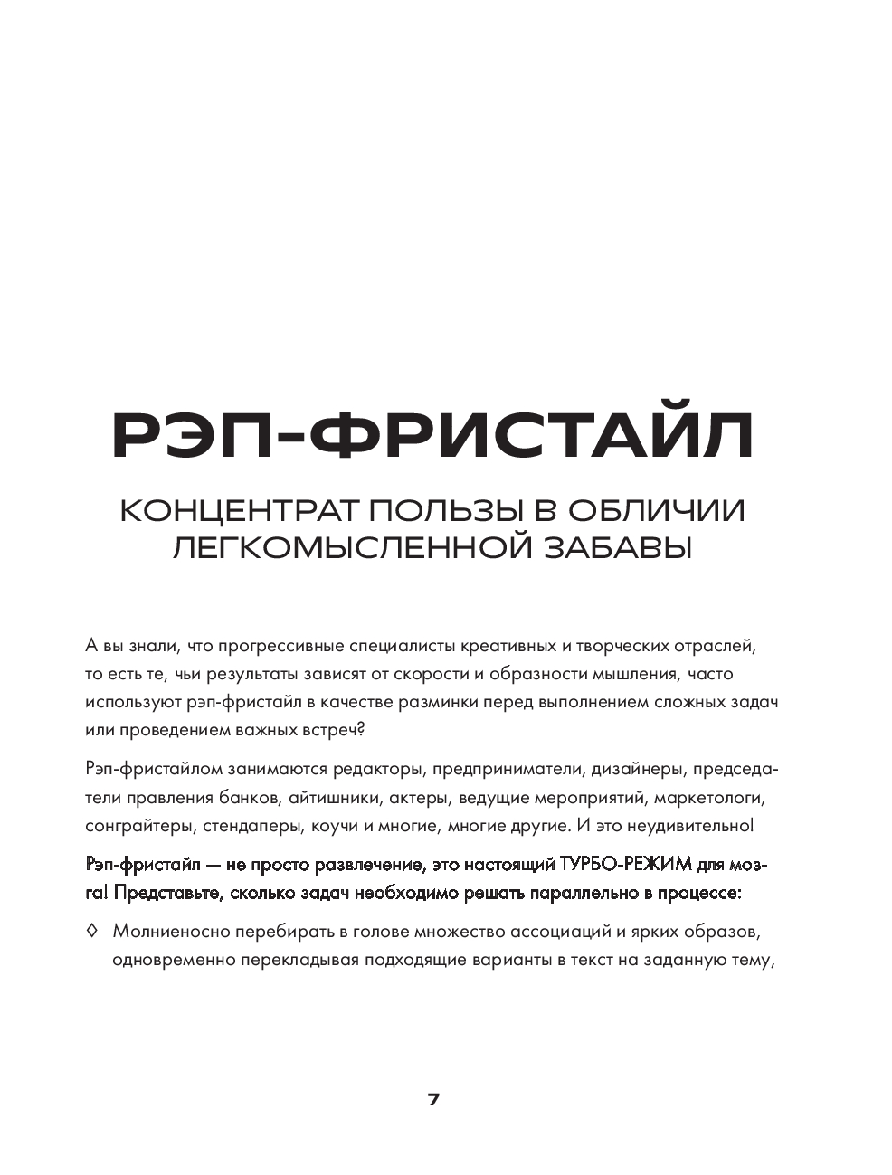 Рэп-фристайл – это не только музыкальное направление, но и отличная разминка для тех, чьи результаты зависят от скорости мышления. Предприниматели, дизайнеры, айтишники, актеры и ведущие мероприятий занимаются им, чтобы быстрее решать свои задачи. Пришло время и вам познакомиться с этим турбо-режимом для мозга! С помощью упражнений и мастер-классов, представленных в этой книге, читатель откроет для себя новые грани импровизации и научится оперативно достигать поставленные цели.