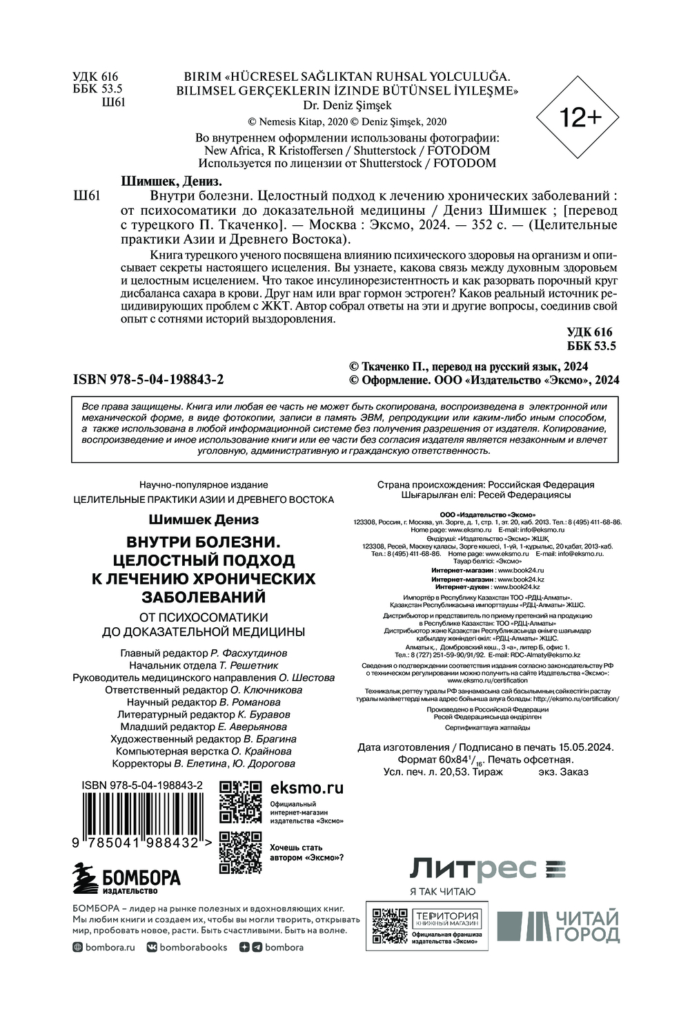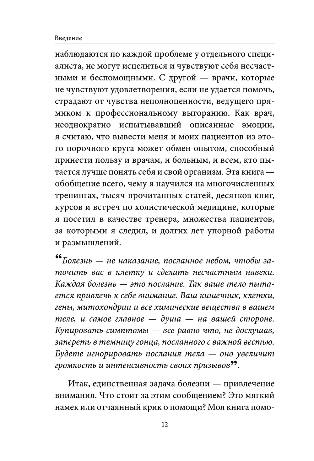 Книга турецкого ученого посвящена влиянию психического здоровья на организм и описывает секреты настоящего исцеления. Вы узнаете, какова связь между духовным здоровьем и целостным исцелением. Что такое инсулинорезистентность и как разорвать порочный круг дисбаланса сахара в крови. Друг нам или враг гормон эстроген? Каков реальный источник рецидивирующих проблем с ЖКТ. Автор собрал ответы на эти и другие вопросы, соединив свой опыт с сотнями историй выздоровления.