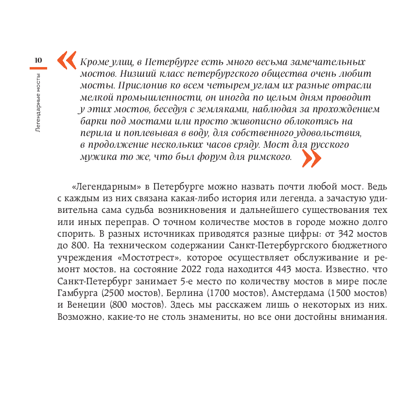 Санкт-Петербург занимает пятое место по количеству мостов в мире после Гамбурга, Берлина, Амстердама и Венеции. 443 моста, 443 уникальных проекта и истории, кроющиеся за их строительством и "повседневной жизнью".