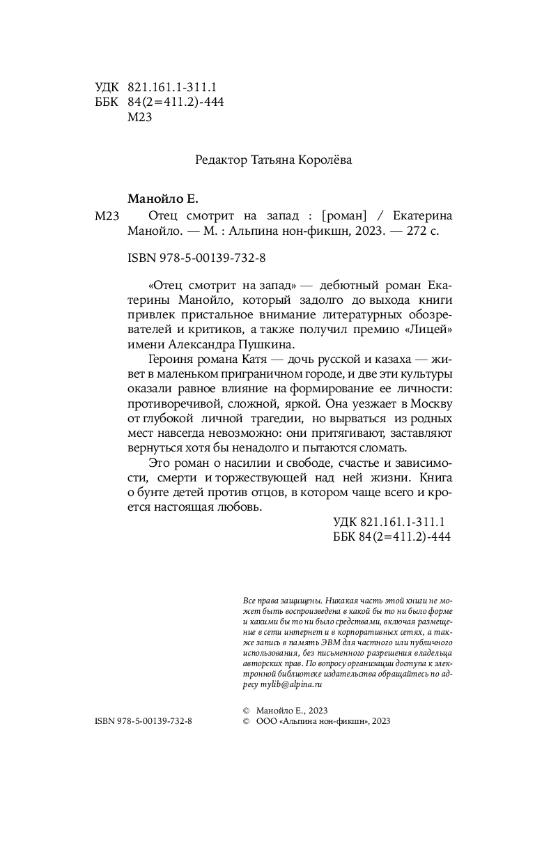 Дебютный роман Екатерины Манойло, который задолго до выхода книги привлек пристальное внимание литературных обозревателей и критиков, а также получил премию "Лицей" имени Александра Пушкина.