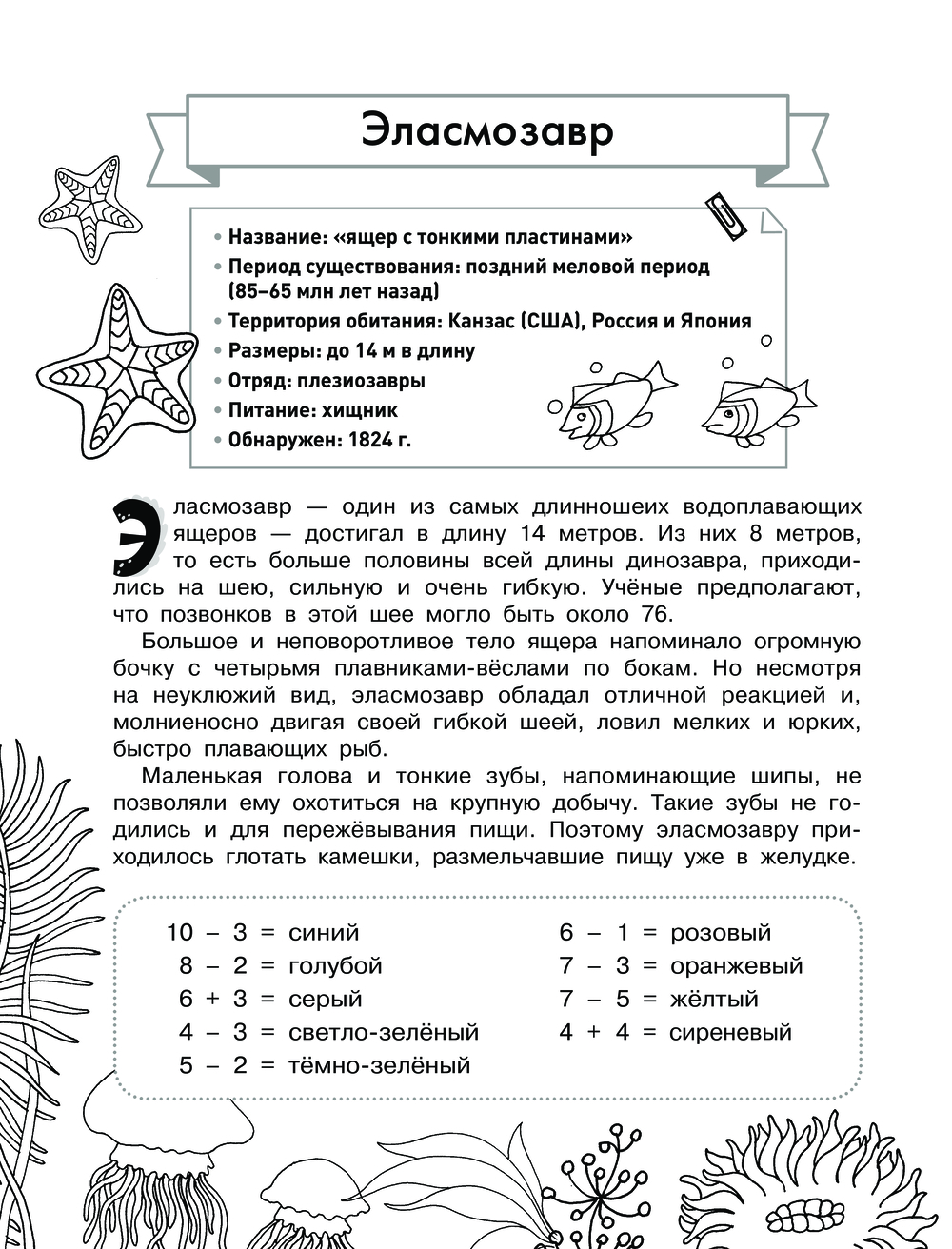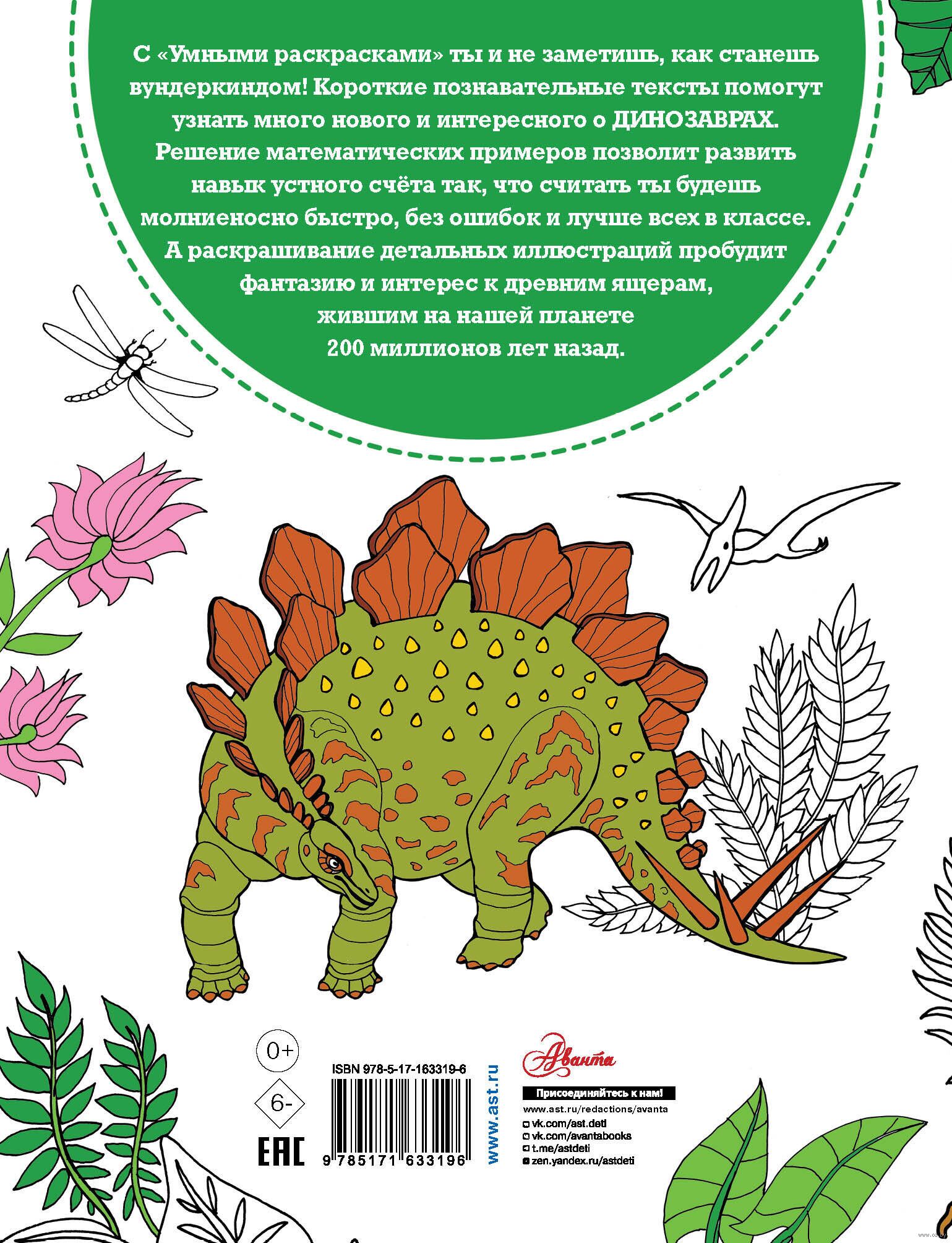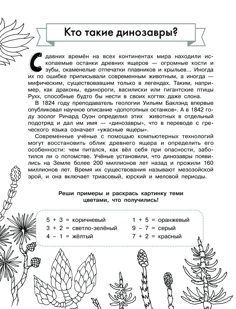 Эта книга – не просто раскраска, а самая настоящая маленькая энциклопедия, которая расскажет о древних ящерах, населявших нашу планету миллионы лет назад. Какими были знаменитые динозавры? Когда жили? Какими способностями обладали и как учёные восстанавливали их облик? Обо всём этом вы узнаете из книги! А попутно потренируете навык устного счёта, ведь на каждом развороте около раскраски есть математические примеры, которые помогут выбрать нужный цвет.