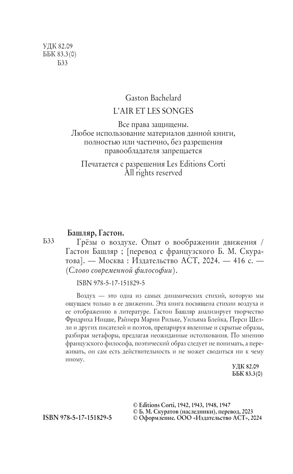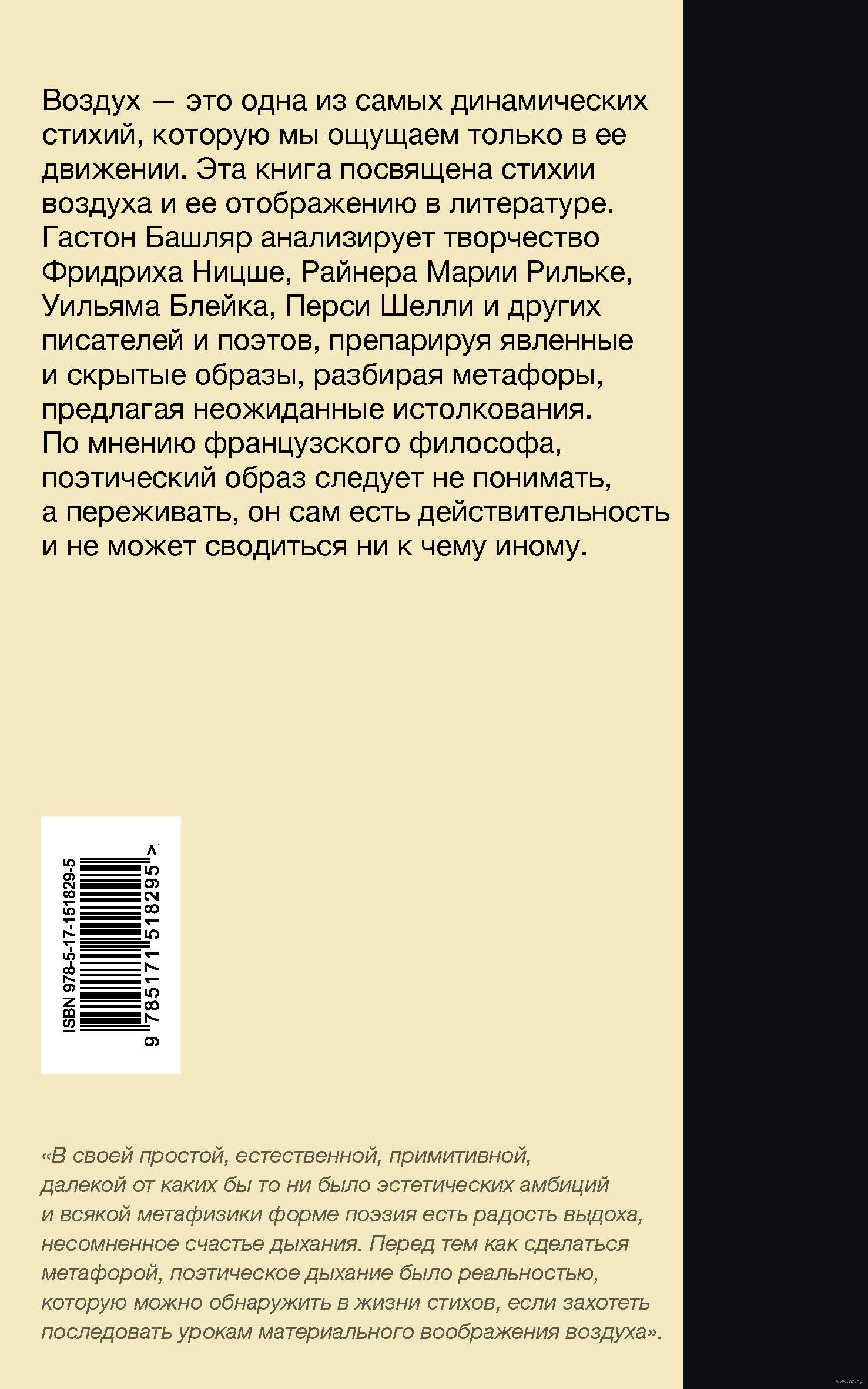 Воздух – это одна из самых динамических стихий, которую мы ощущаем только в ее движении. Эта книга посвящена стихии воздуха и ее отображению в литературе. Гастон Башляр анализирует творчество Фридриха Ницше, Райнера Марии Рильке, Уильяма Блейка, Перси Шелли и других писателей и поэтов, препарируя явленные и скрытые образы, разбирая метафоры, предлагая неожиданные истолкования. По мнению французского философа, поэтический образ следует не понимать, а переживать, он сам есть действительность и не может сводиться ни к чему иному.