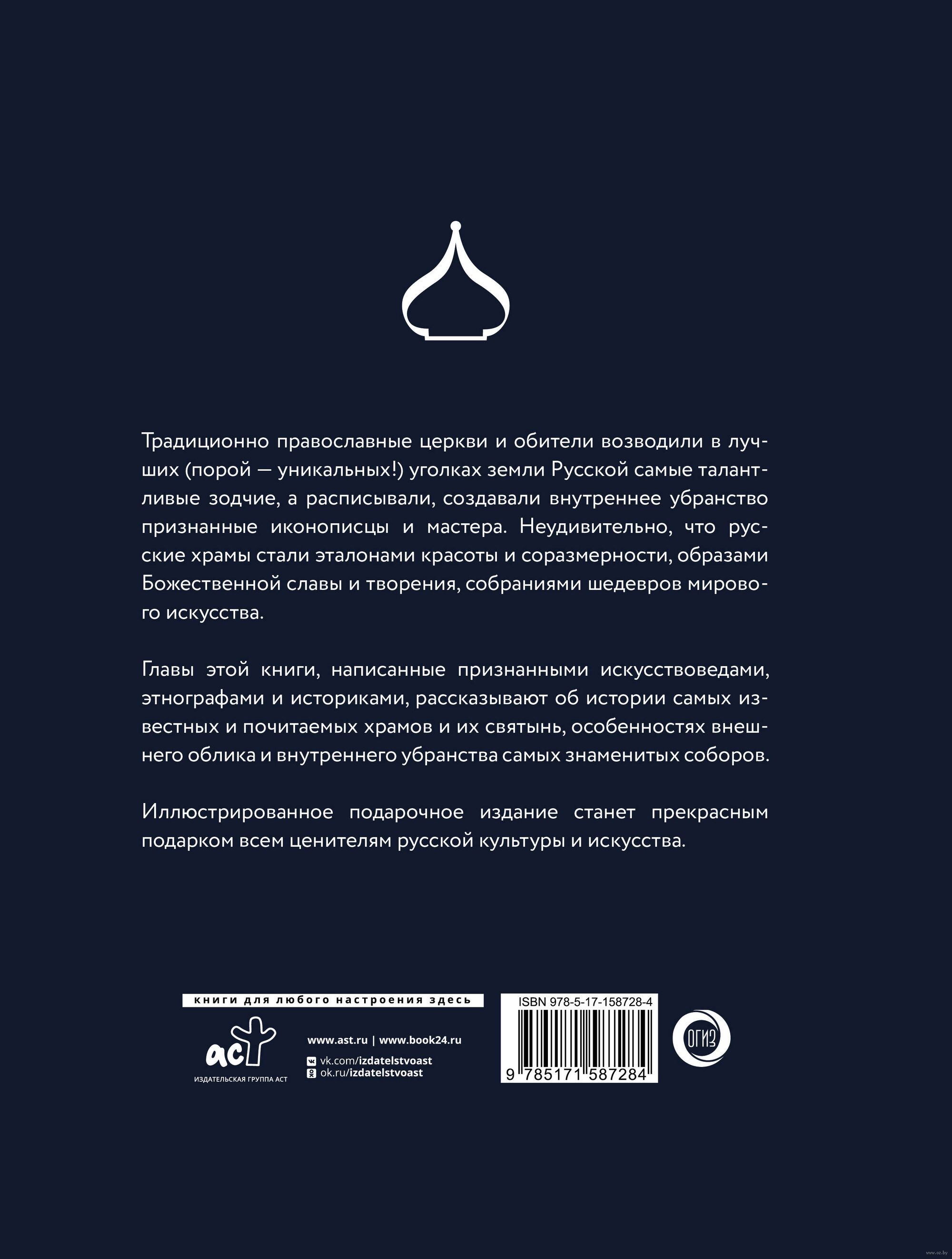 Главы этой книги, написанные признанными искусствоведами, этнографами и историками, рассказывают об истории самых известных и почитаемых храмов и их святынь, особенностях внешнего облика и внутреннего убранства самых знаменитых соборов.