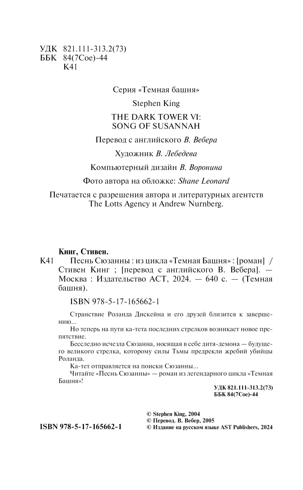 | Название в оригинале | The Dark Tower VI: Song of Susannah |