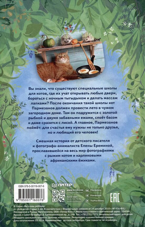 Вы знали о том, что существуют специальные школы для котов, где их учат открывать любые двери, бороться с ночным тыгыдыком и даже делать массаж лапками? Кот Пармезанов тоже не знал, пока его туда не сдали недобросовестные хозяева. Но на этом его приключения не закончатся. Ему предстоит отправиться на лето в загородный дом, научиться ловить крыс, петь басом, а также преодолеть робость и страх, чтобы защитить своих новых друзей: игривую муху, двух шаловливых ёжиков Герду и Снежу и золотую рыбку Аделаиду.