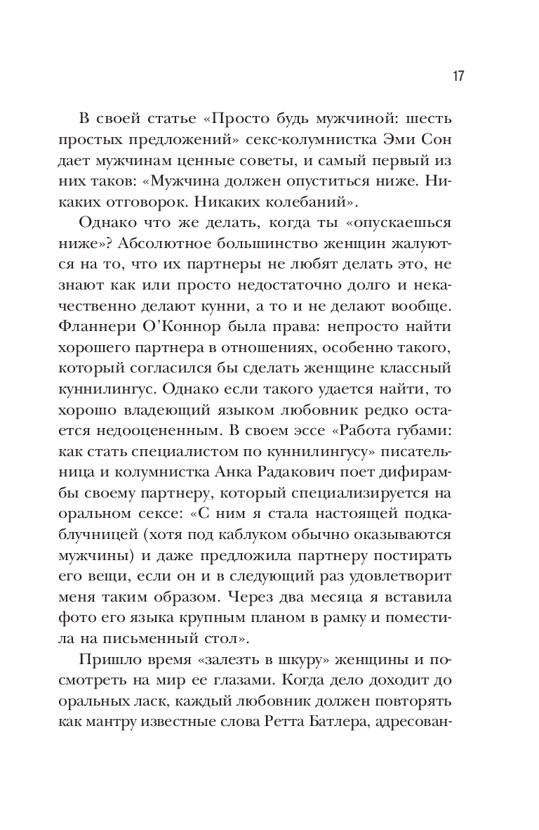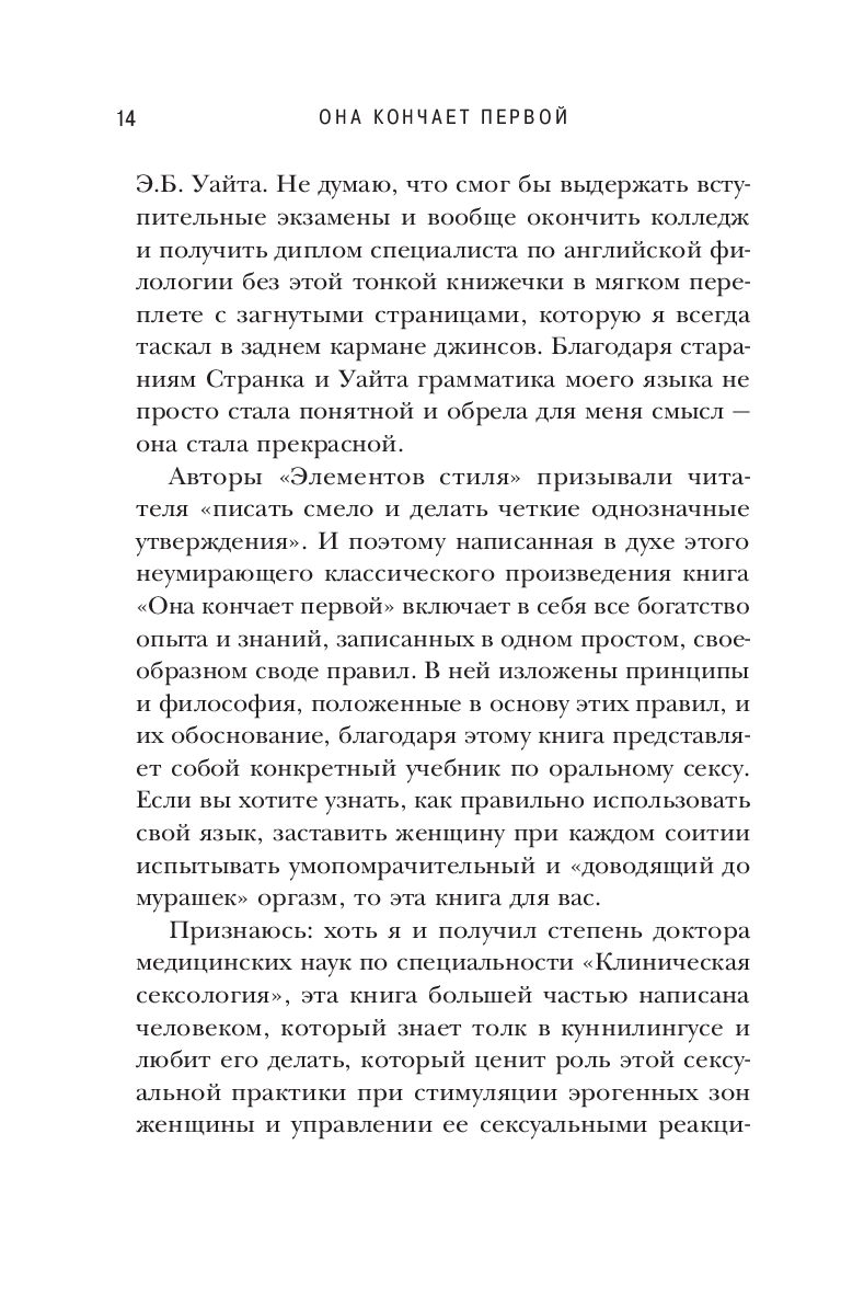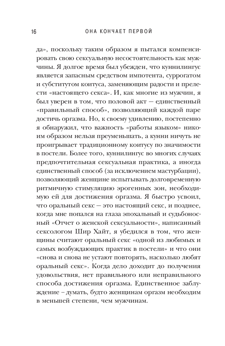 Книга "Она кончает первой" объясняет, как устроено женское тело и предлагает пошаговые инструкции, как удовлетворить партнершу при помощи языка и довести ее до множественных оргазмов.