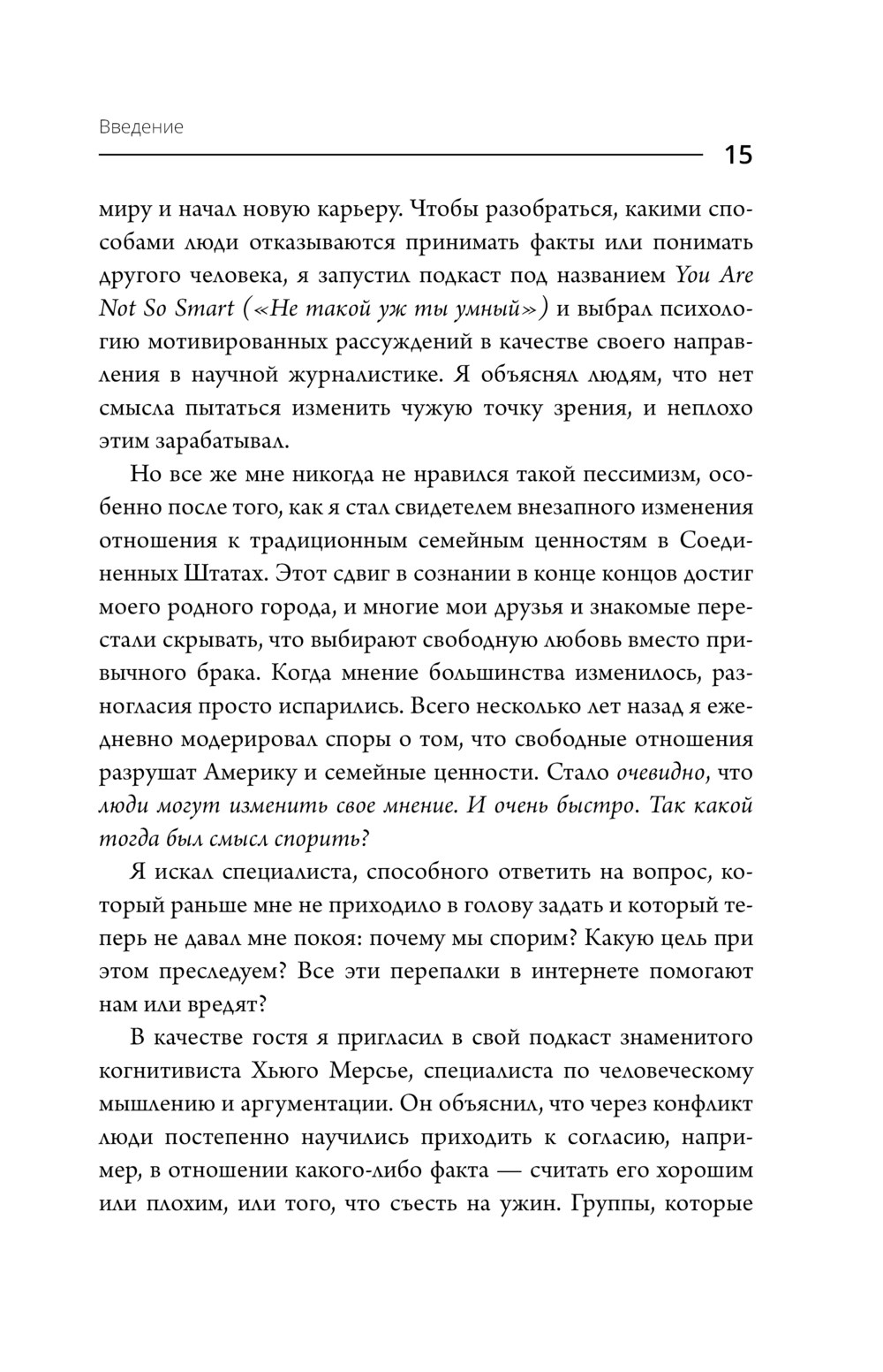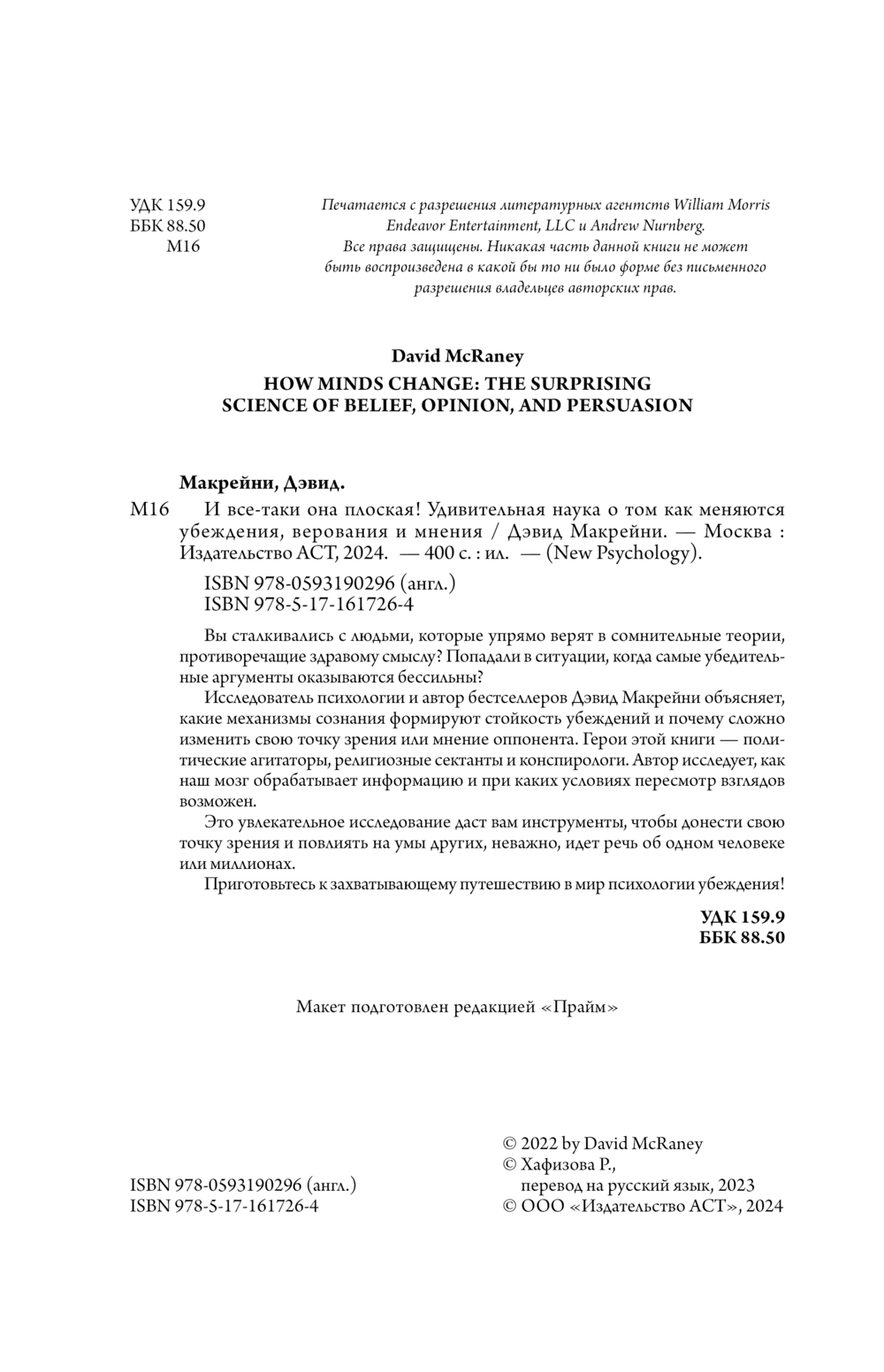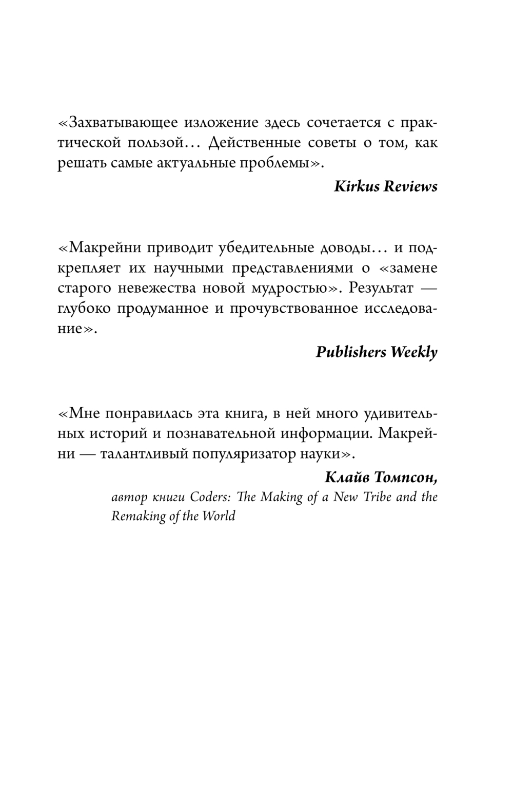 Исследователь психологии и автор бестселлеров Дэвид Макрейни объясняет, какие механизмы сознания формируют стойкость убеждений и почему сложно изменить свою точку зрения или мнение оппонента. Герои этой книги – политические агитаторы, религиозные сектанты и конспирологи. Автор исследует, как наш мозг обрабатывает информацию и при каких условиях пересмотр взглядов возможен.