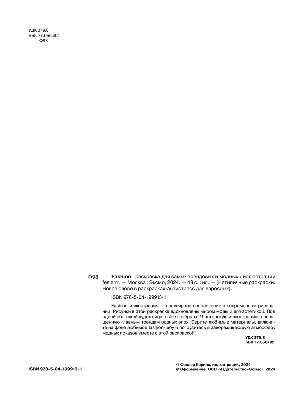 На страницах этой раскраски-антистресс вас ждут 22 авторские иллюстрации от талантливой художницы feslerrr. Потрясающие наряды, вдохновленные главными домами моды, фигуры изящных моделей, а также заряд вдохновения для создания собственных стильных образов – все это и не только ждет вас под одной обложкой!