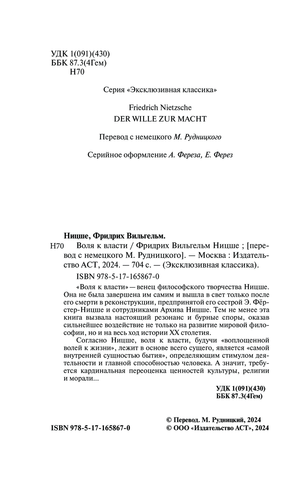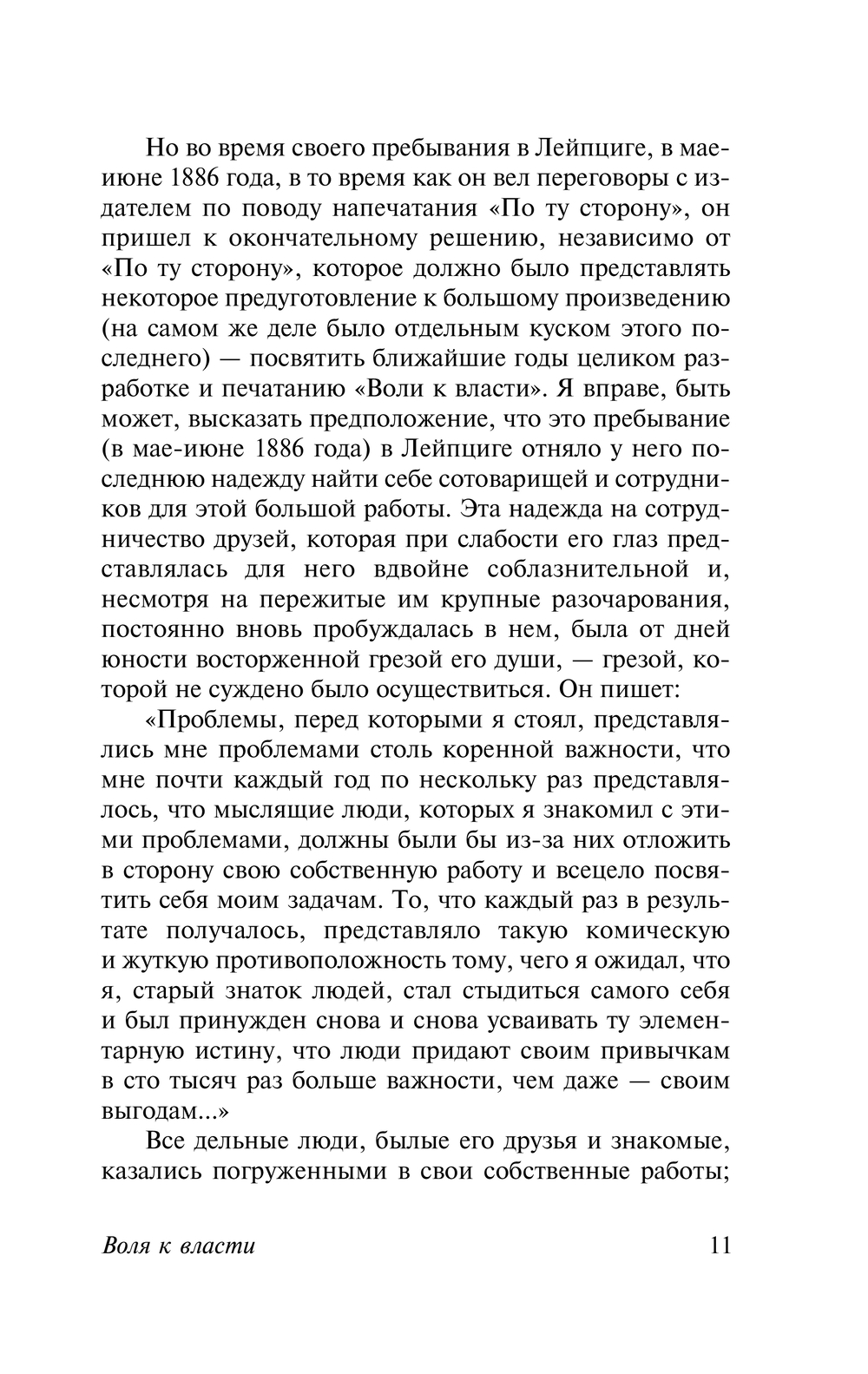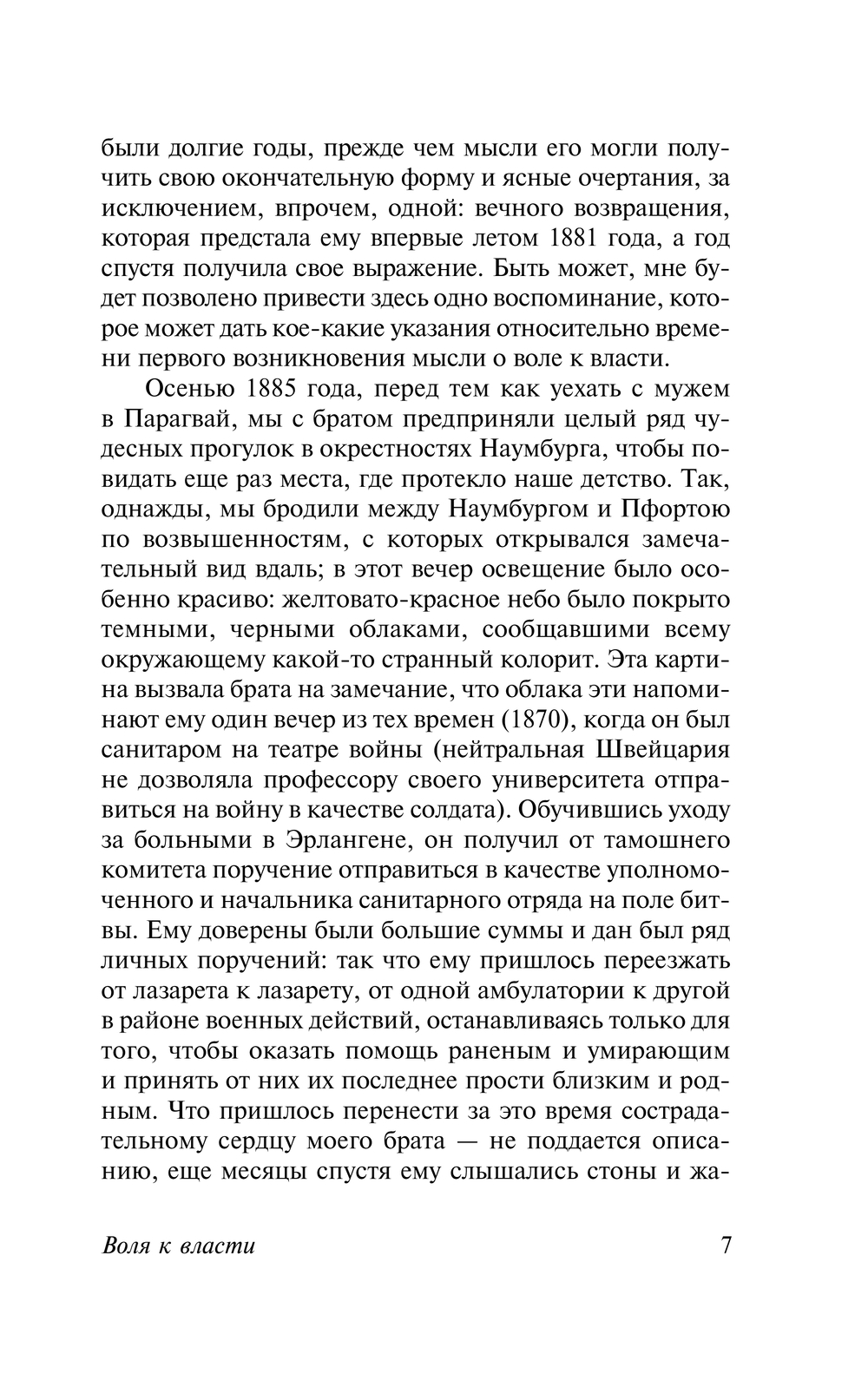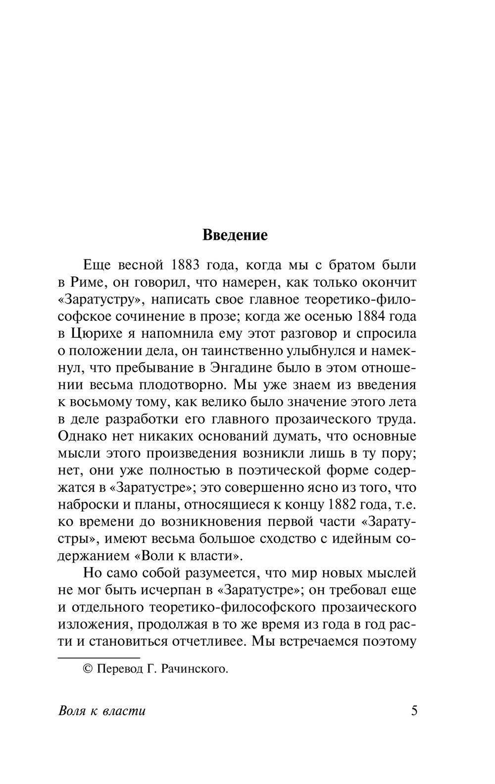 "Воля к власти" – венец философского творчества Ницше. Она не была завершена им самим и вышла в свет только после его смерти в реконструкции, предпринятой его сестрой Э. Фёрстер-Ницше и сотрудниками Архива Ницше. Тем не менее, эта книга вызвала настоящий резонанс и бурные споры, оказав сильнейшее воздействие не только на развитие мировой философии, но и на весь ход истории XX столетия.