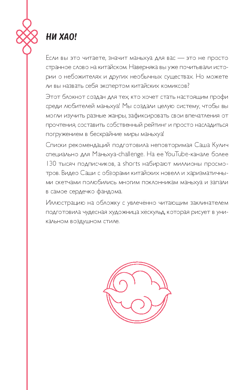 "Маньхуа-challenge" – это вызов тем, кто считает себя настоящим поклонником маньхуа и манхвы! Блокнот сделан в коллаборации с топовым контентмейкером Сашей Кулич, которая специализируется на обзорах китайских новелл. На ее youtube-канале более 130 тысяч подписчиков, а ролики набирают миллионы просмотров! Саша стала популярной благодаря shorts с юмористическими ситуациями, которые попали в самое сердечко фандома.