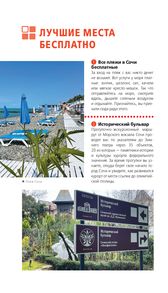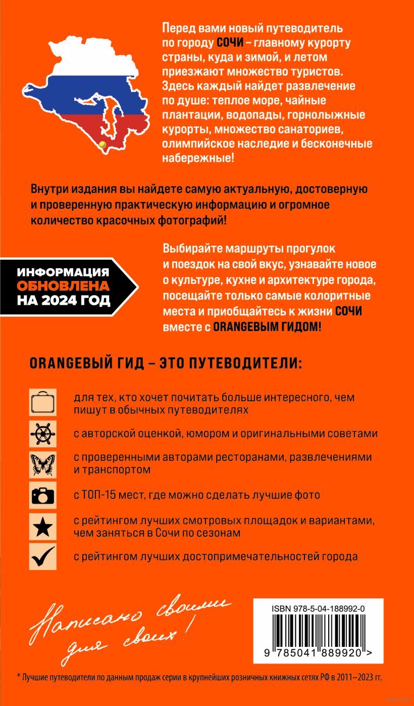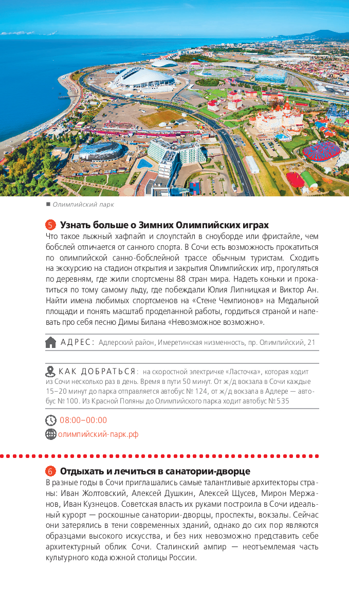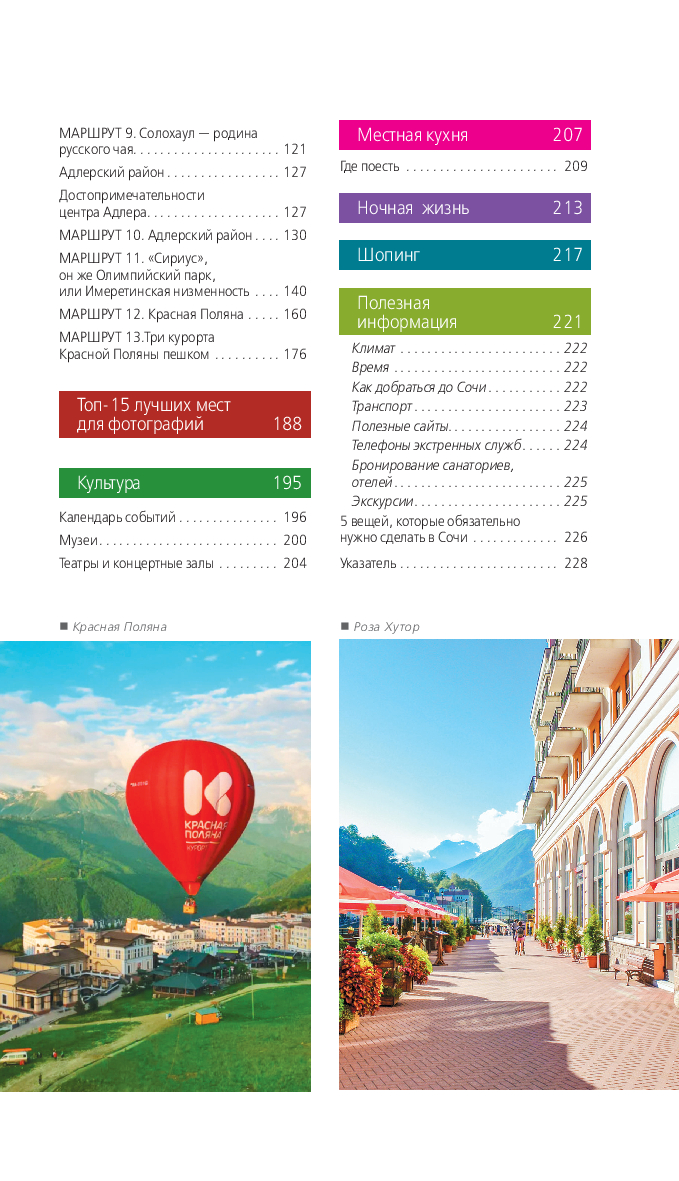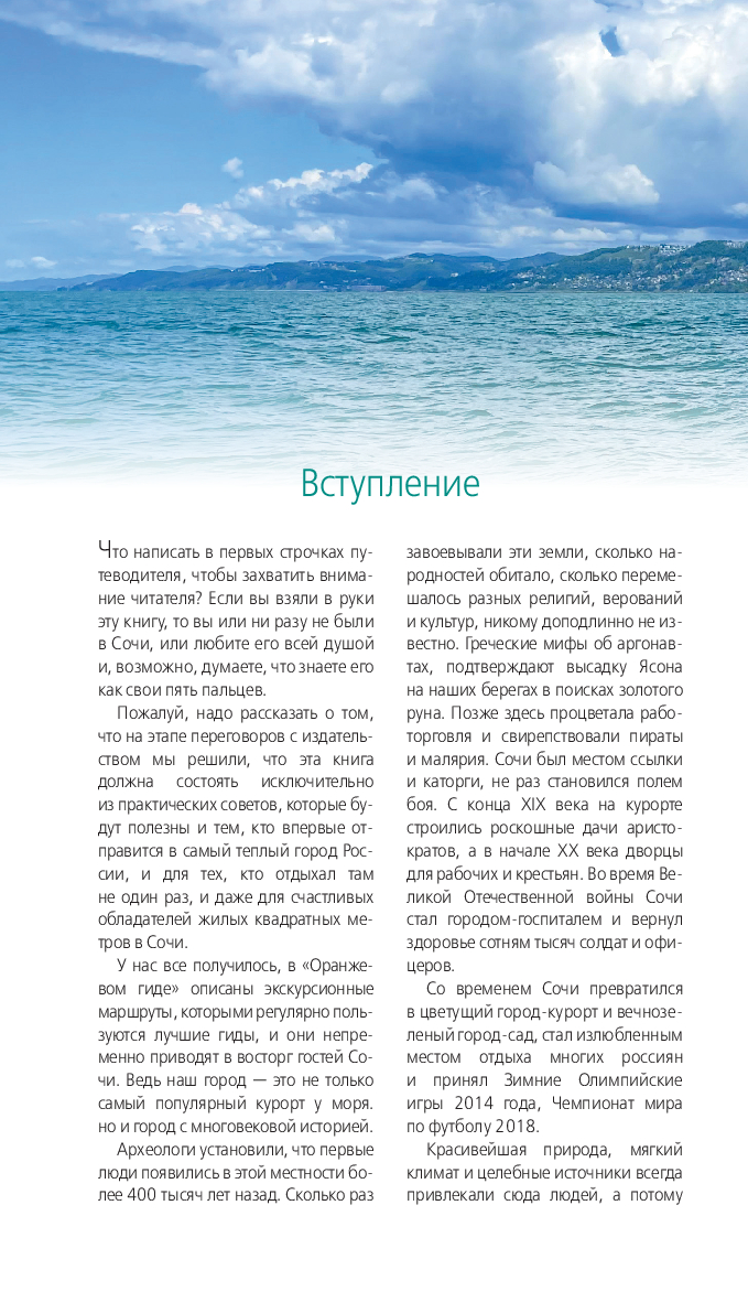 В нем содержится актуальная и полезная информация о Сочи, различные маршруты на любой вкус, подсказки, что делать, если идет дождь, или где искать лучшие смотровые площадки, а также множество полезных советов от автора Ирины Сущевой, которая является местным гидом и блогером. Сориентироваться на местности помогут удобные карты, расположенные на страницах путеводителя.