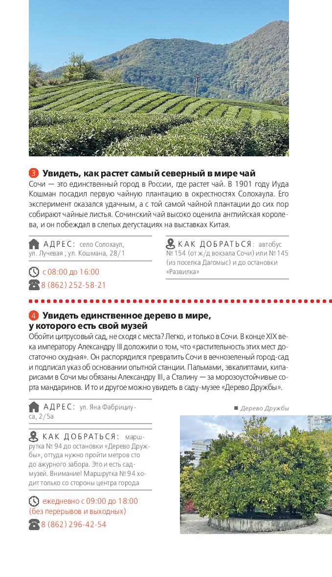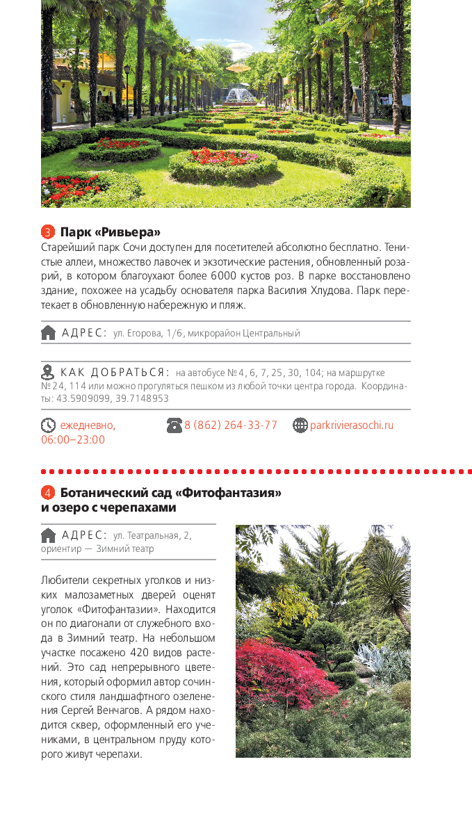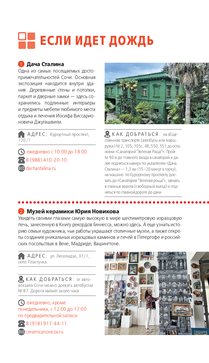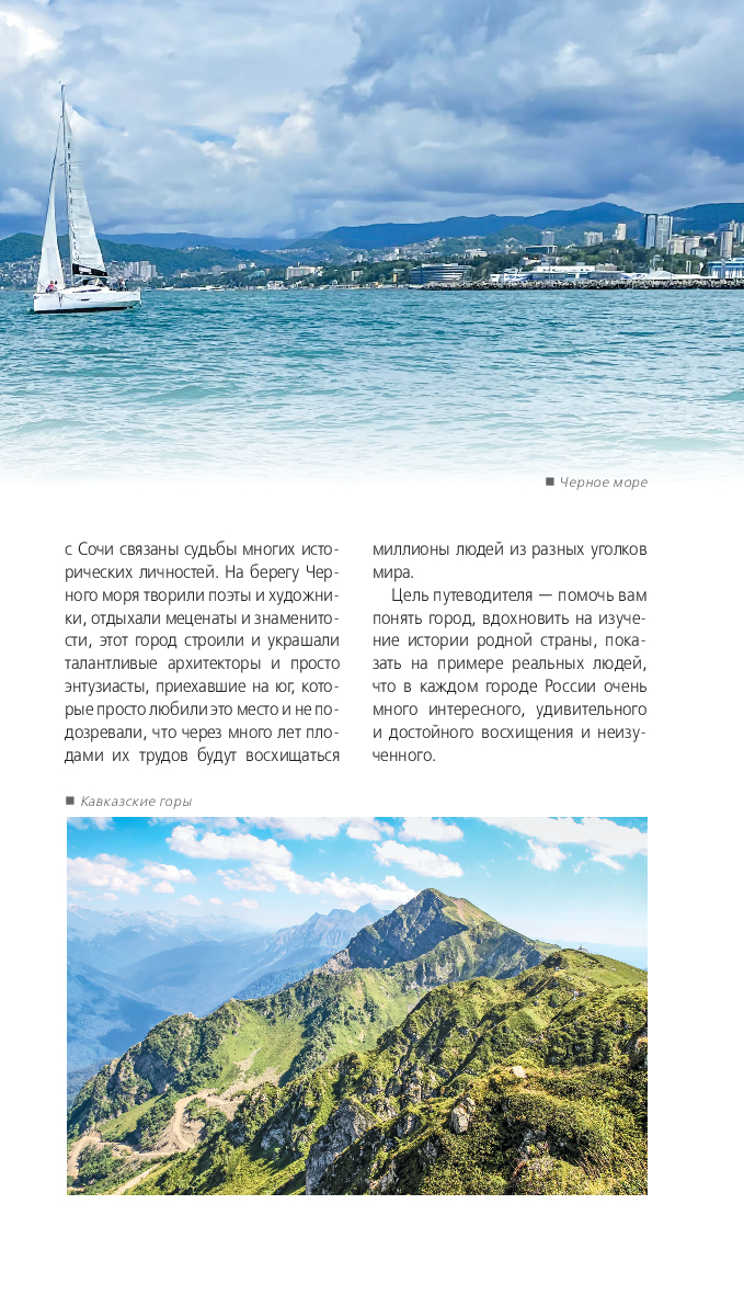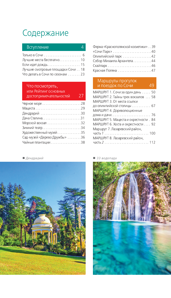В нем содержится актуальная и полезная информация о Сочи, различные маршруты на любой вкус, подсказки, что делать, если идет дождь, или где искать лучшие смотровые площадки, а также множество полезных советов от автора Ирины Сущевой, которая является местным гидом и блогером. Сориентироваться на местности помогут удобные карты, расположенные на страницах путеводителя.