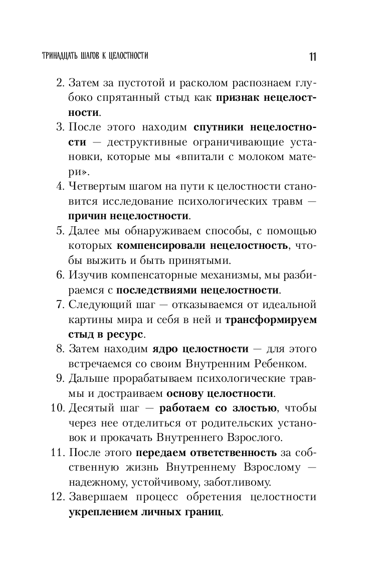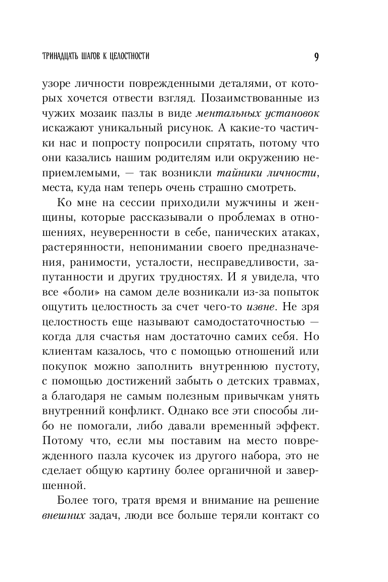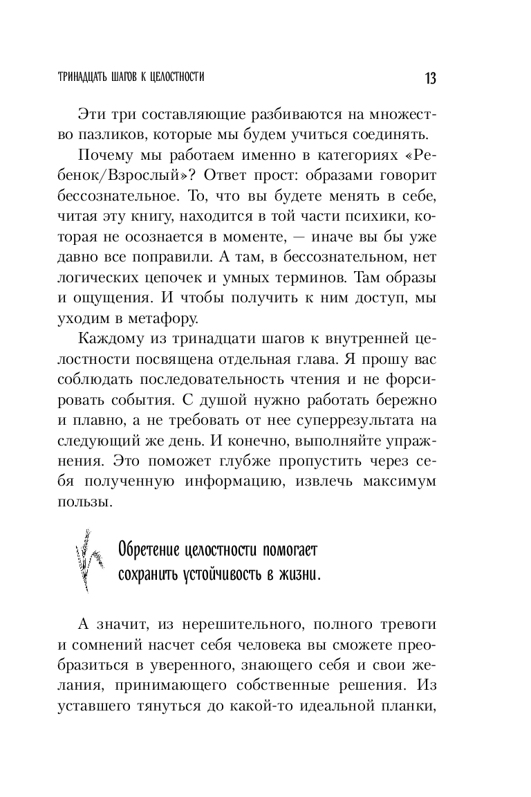 Целостность – это единство и гармоничное взаимодействие всех сторон личности. Когда она нарушается, мы чувствуем внутреннюю пустоту, тревогу и напряжение. Чтобы от них избавиться, мы пытаемся занять себя работой или развлечениями, бесконечным саморазвитием и поиском смысла жизни. Но единственный путь к целостности – принятие себя. Эта книга предлагает 13 последовательных шагов по преодолению внутренних конфликтов и заполнения душевной пустоты.