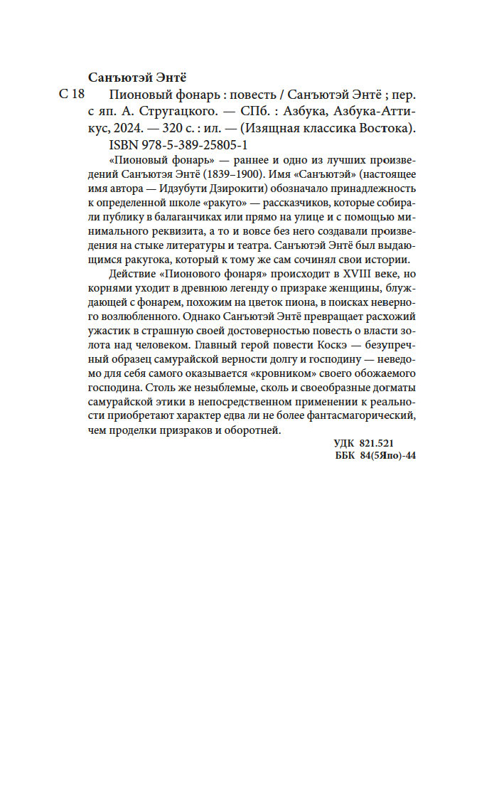 "Пионовый фонарь" – раннее и одно из лучших произведений Санъютэя Энтё (1839-1900). Имя "Санъютэй" (настоящее имя автора – Идзубути Дзирокити) обозначало принадлежность к определенной школе "ракуго" – рассказчиков, которые собирали публику в балаганчиках или прямо на улице и с помощью минимального реквизита, а то и вовсе без него создавали произведения на стыке литературы и театра. Санъютэй Энтё был выдающимся ракугока, который к тому же сам сочинял свои истории.