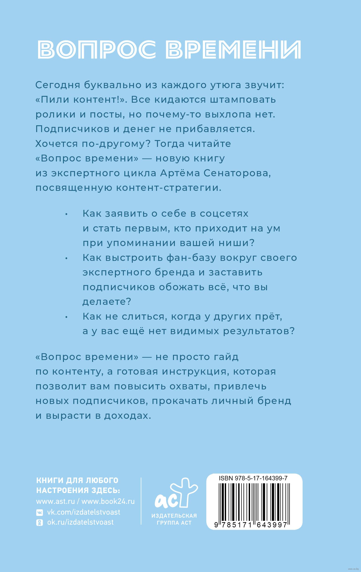 Сегодня буквально из каждого утюга звучит: "Пили контент!" Все кидаются штамповать ролики и посты, но почему-то выхлопа нет. Подписчиков и денег не прибавляется. Хочется по-другому? Тогда читайте "Вопрос времени" – новую книгу из экспертного цикла Артёма Сенаторова, посвященную контентстратегии.