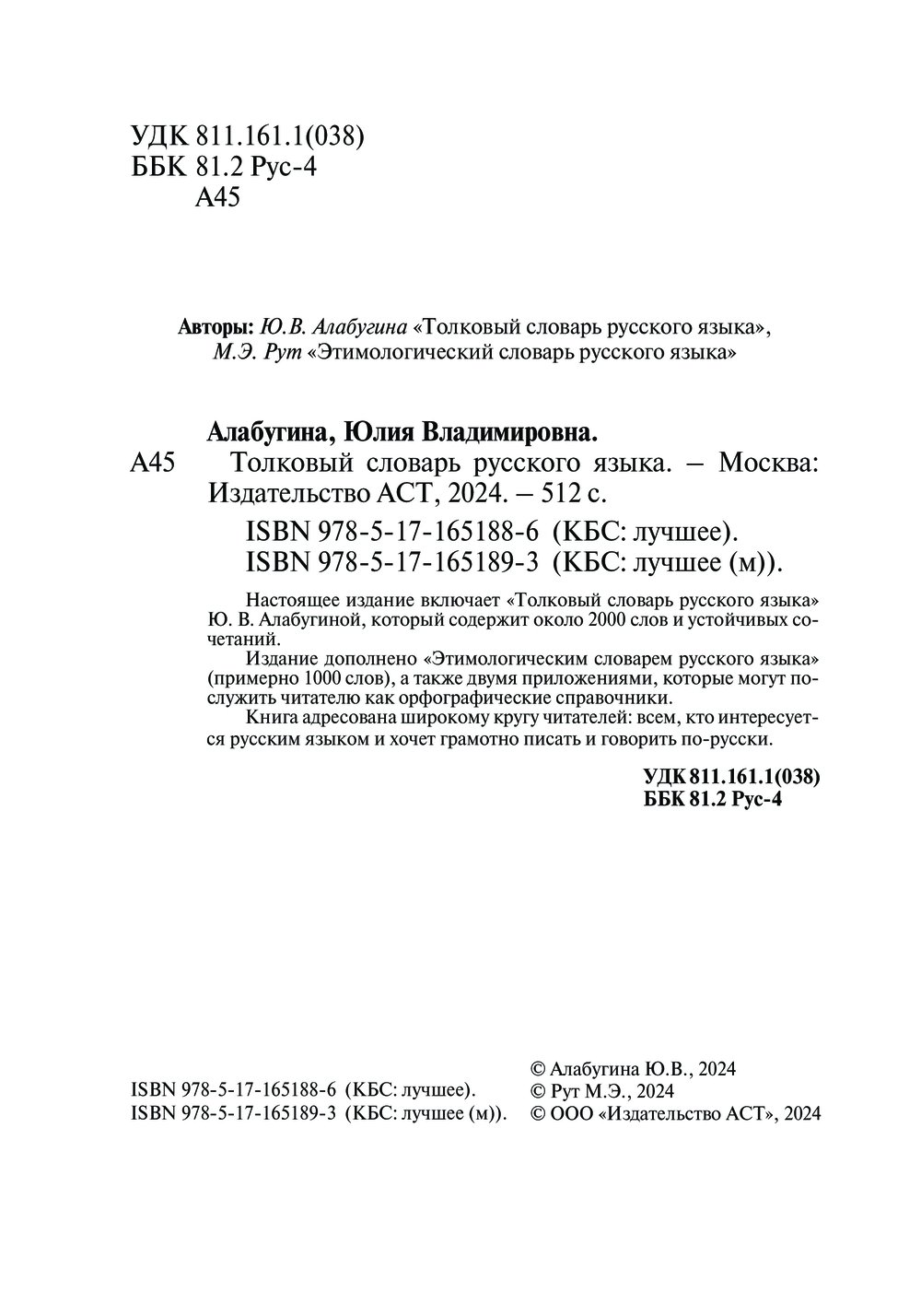 Настоящее издание включает "Толковый словарь русского языка" Ю. В. Алабугиной, который содержит около 2000 слов и устойчивых сочетаний.