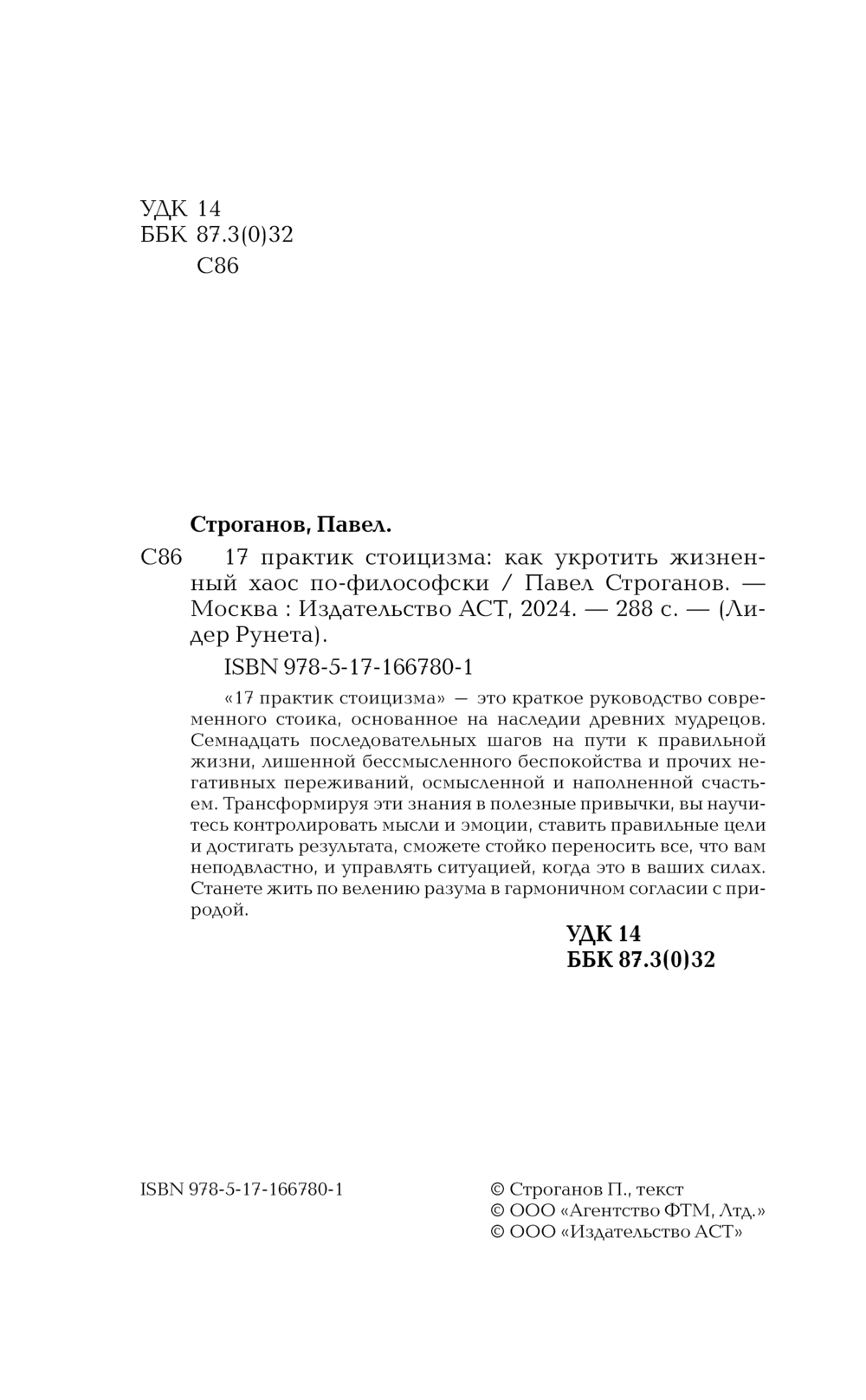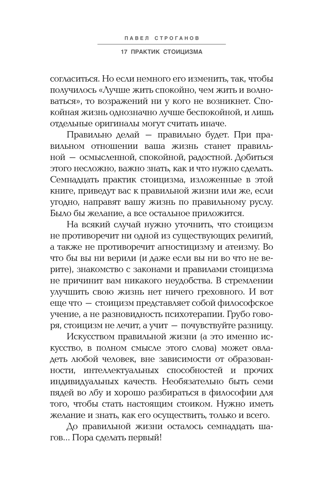 "17 практик стоицизма" – это краткое руководство современного стоика, основанное на наследии древних мудрецов. Семнадцать последовательных шагов на пути к правильной жизни, лишенной бессмысленного беспокойства и прочих негативных переживаний, осмысленной и наполненной счастьем. Трансформируя эти знания в полезные привычки, вы научитесь контролировать мысли и эмоции, ставить правильные цели и достигать результата, сможете стойко переносить все, что вам неподвластно, и управлять ситуацией, когда это в ваших силах. Станете жить по велению разума в гармоничном согласии с природой.