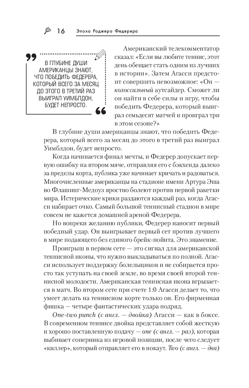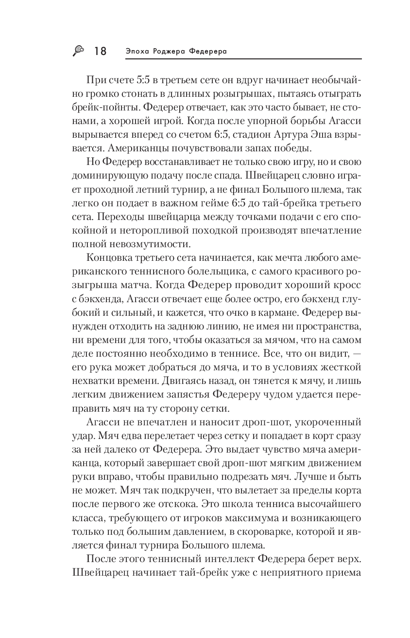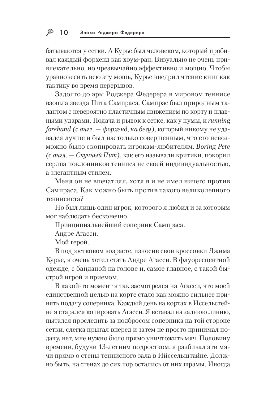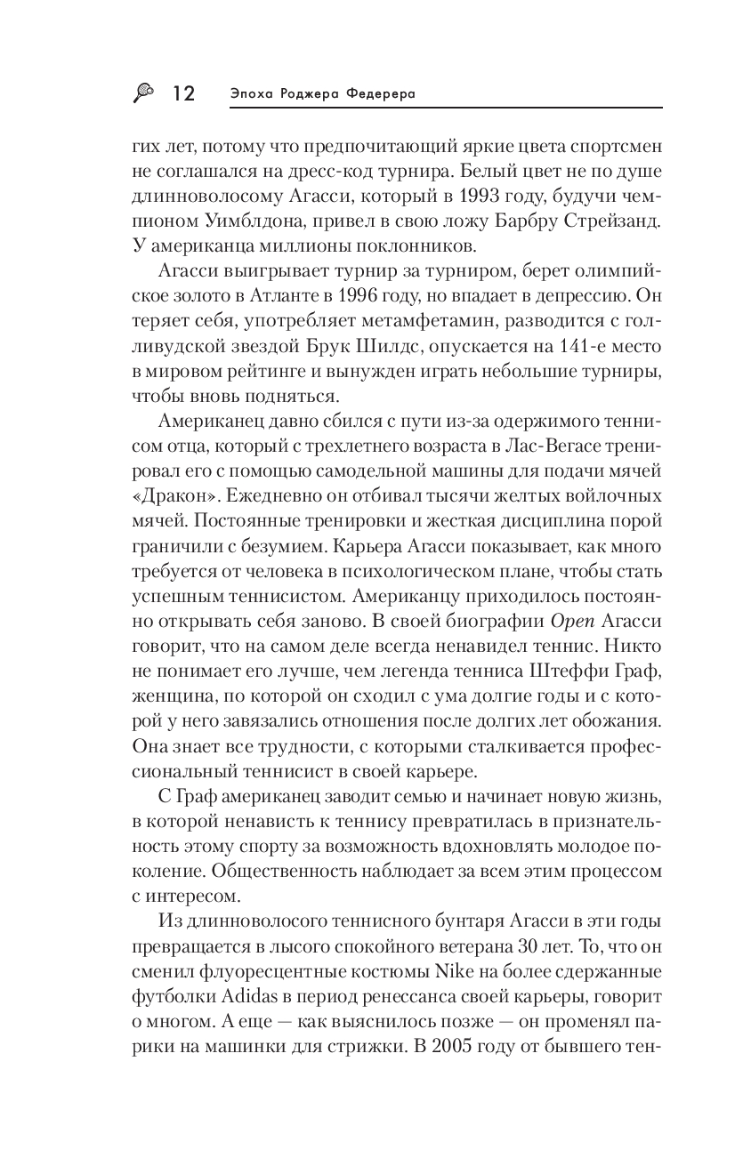 Один из величайших игроков в истории тенниса, обладающий неповторимым стилем и фантастической техникой, он искал совершенства везде – и на корте, и вне его. Он сделался иконой стиля, встал в ряд с самыми авторитетными и уважаемыми спортивными деятелями в мире.