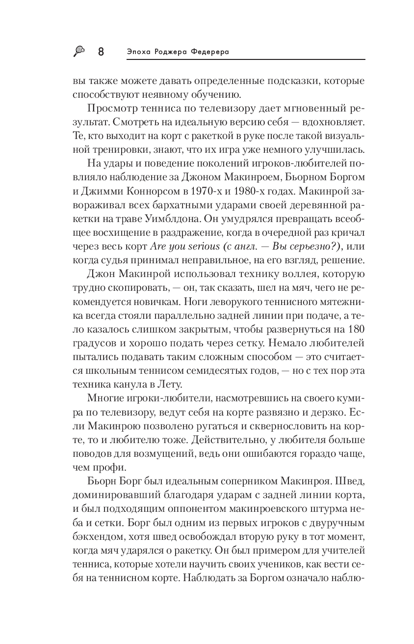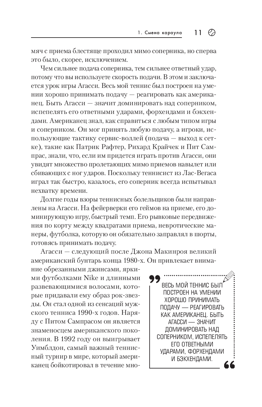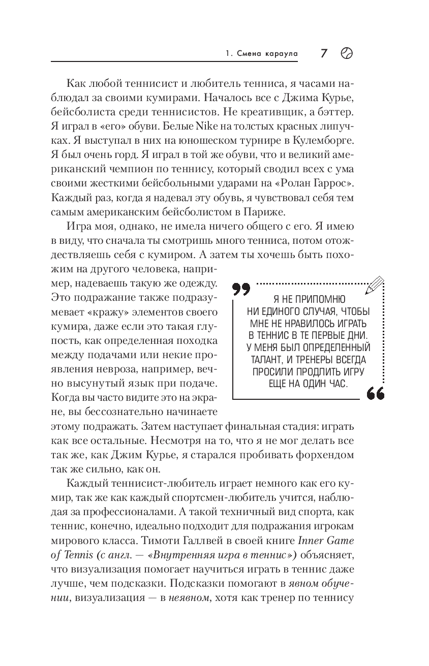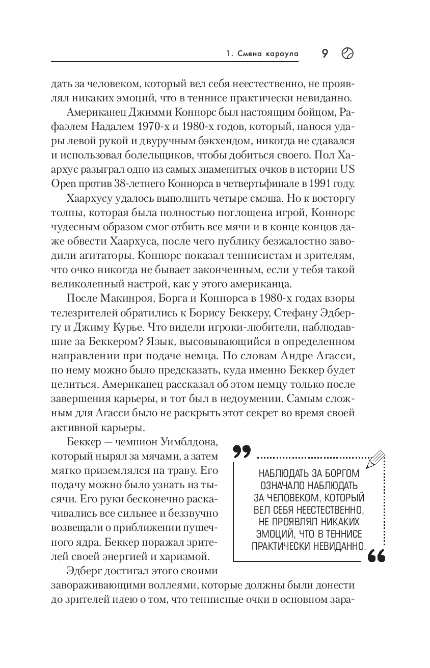 Один из величайших игроков в истории тенниса, обладающий неповторимым стилем и фантастической техникой, он искал совершенства везде – и на корте, и вне его. Он сделался иконой стиля, встал в ряд с самыми авторитетными и уважаемыми спортивными деятелями в мире.