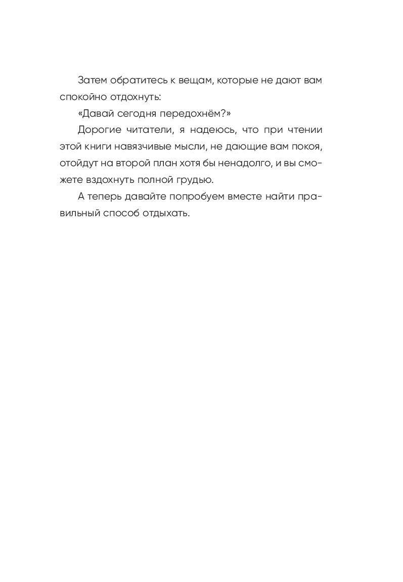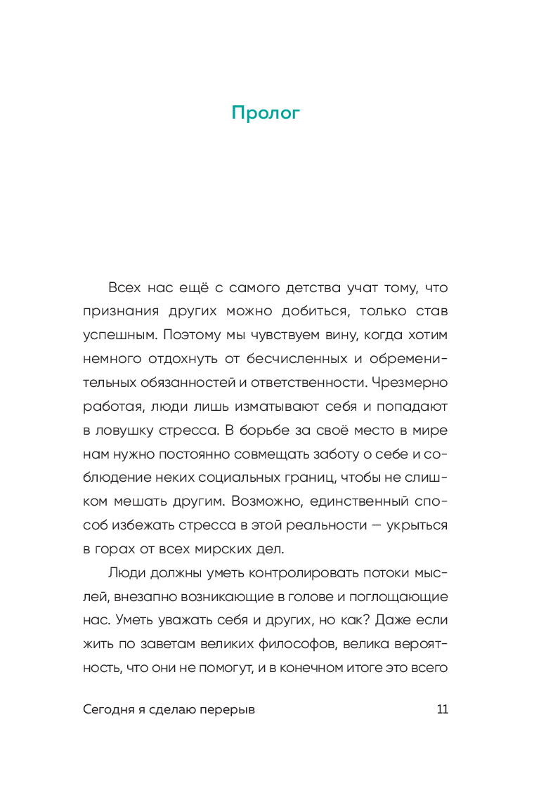 "Сегодня я сделаю перерыв" – это 82 послания для тех, кто поставил свою жизнь на автопилот, вечно откладывает себя на потом и каждый день твердит: "Мне некогда отдыхать, жить, любить, радоваться, мечтать".