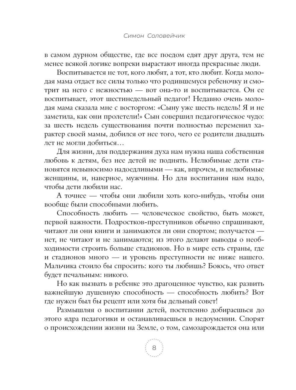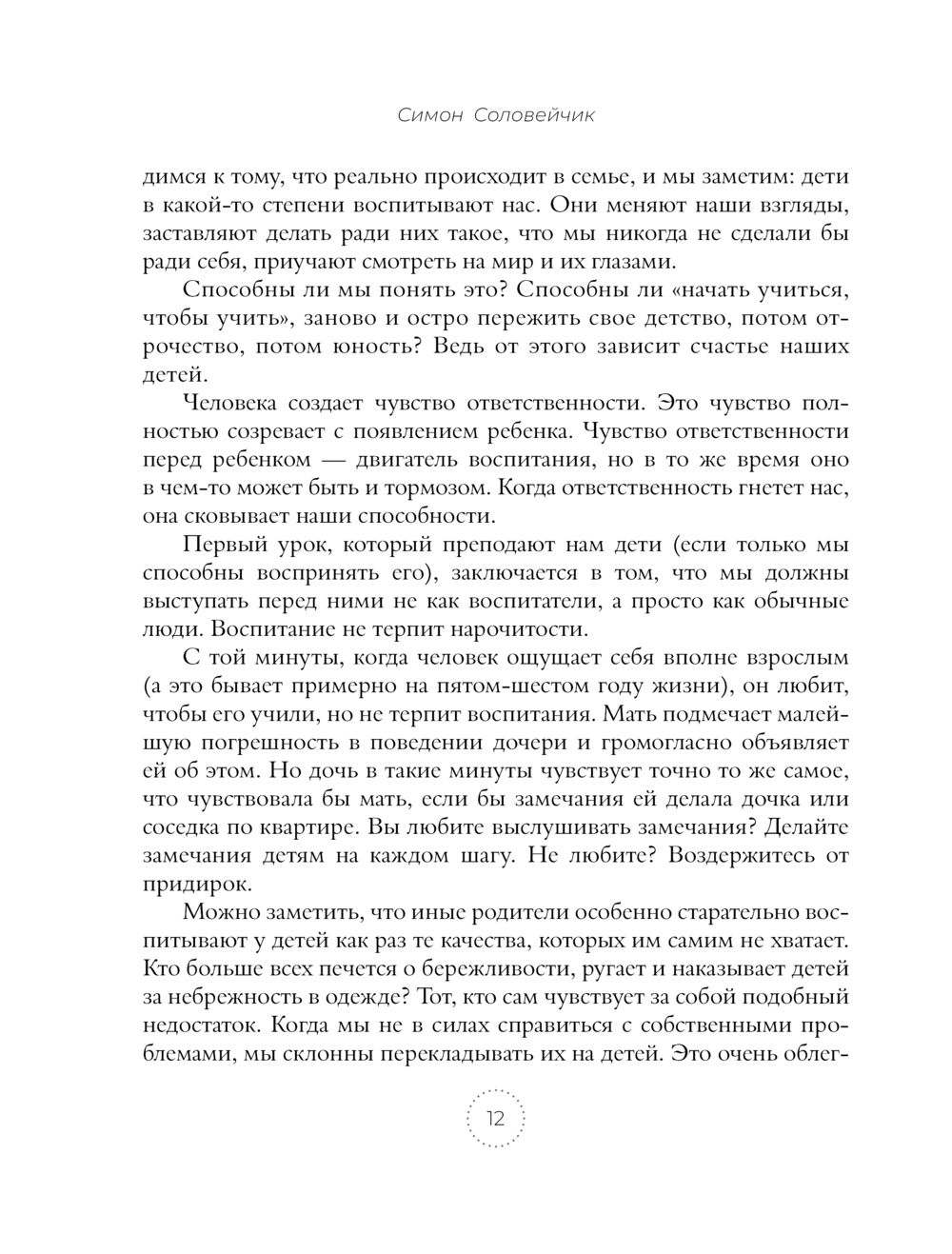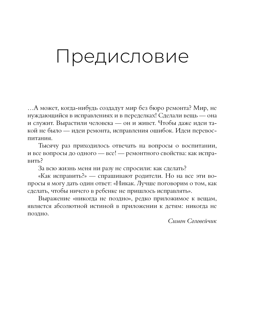 Симон Соловейчик – педагог, писатель, журналист, автор бестселлеров для детей и родителей, а его книги – это собрание уникальных статей о семейном воспитании, каждая из которых – педагогическое открытие в отношениях детей и взрослых. Эти открытия позволяют избежать драматических и порой непоправимых ошибок в воспитании детей.