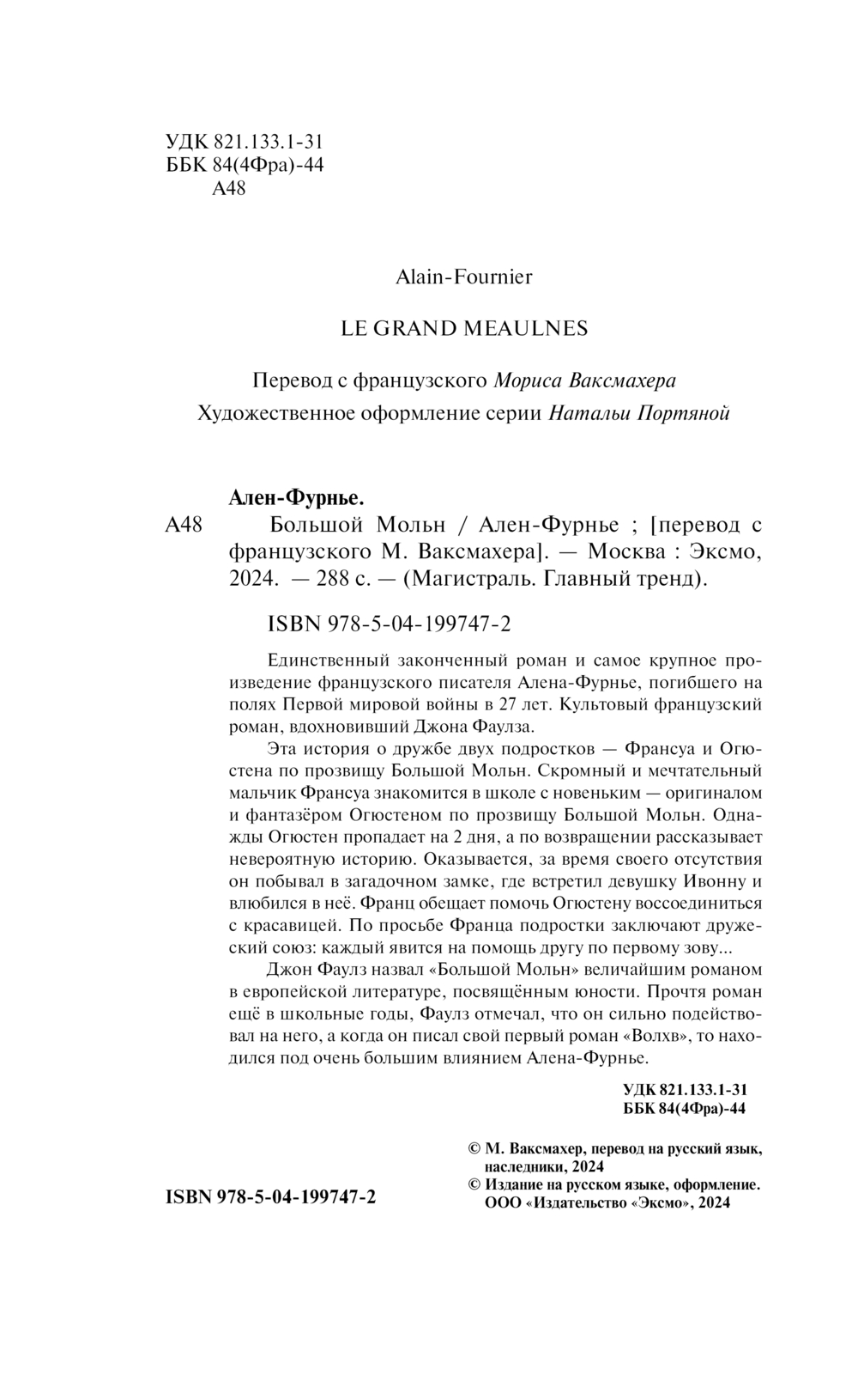 Единственный законченный роман и самое крупное произведение французского писателя Алена-Фурнье, погибшего в 27 лет на полях Первой мировой войны. Культовый текст о юношестве, вдохновивший самого Джона Фаулза.