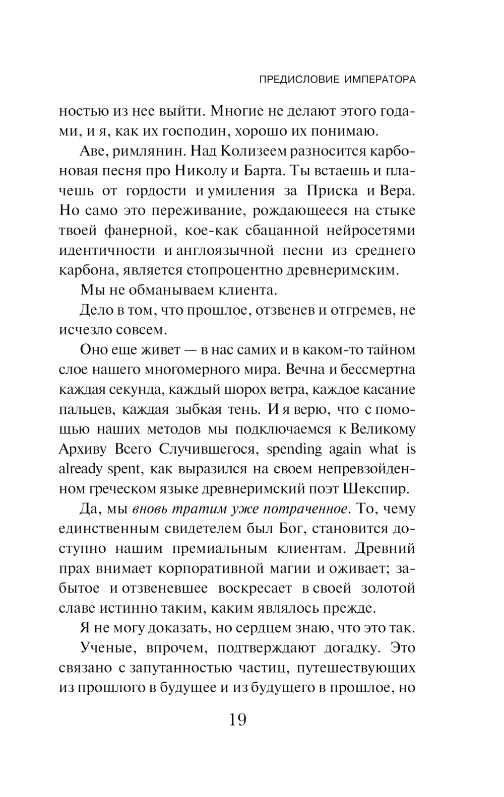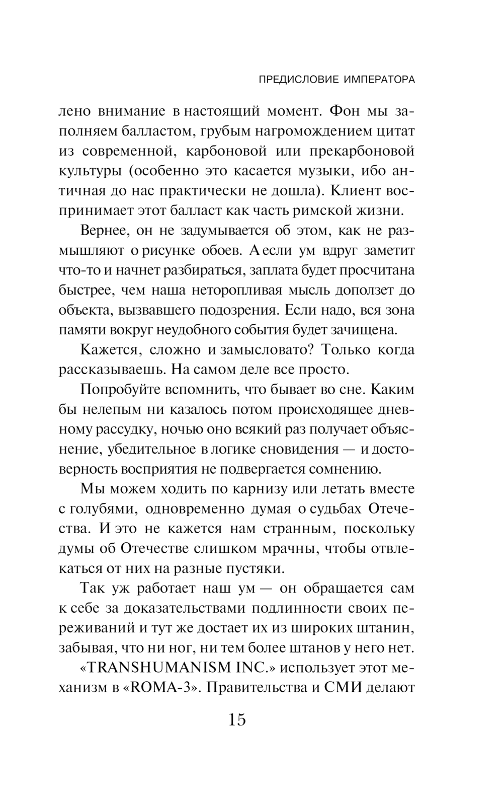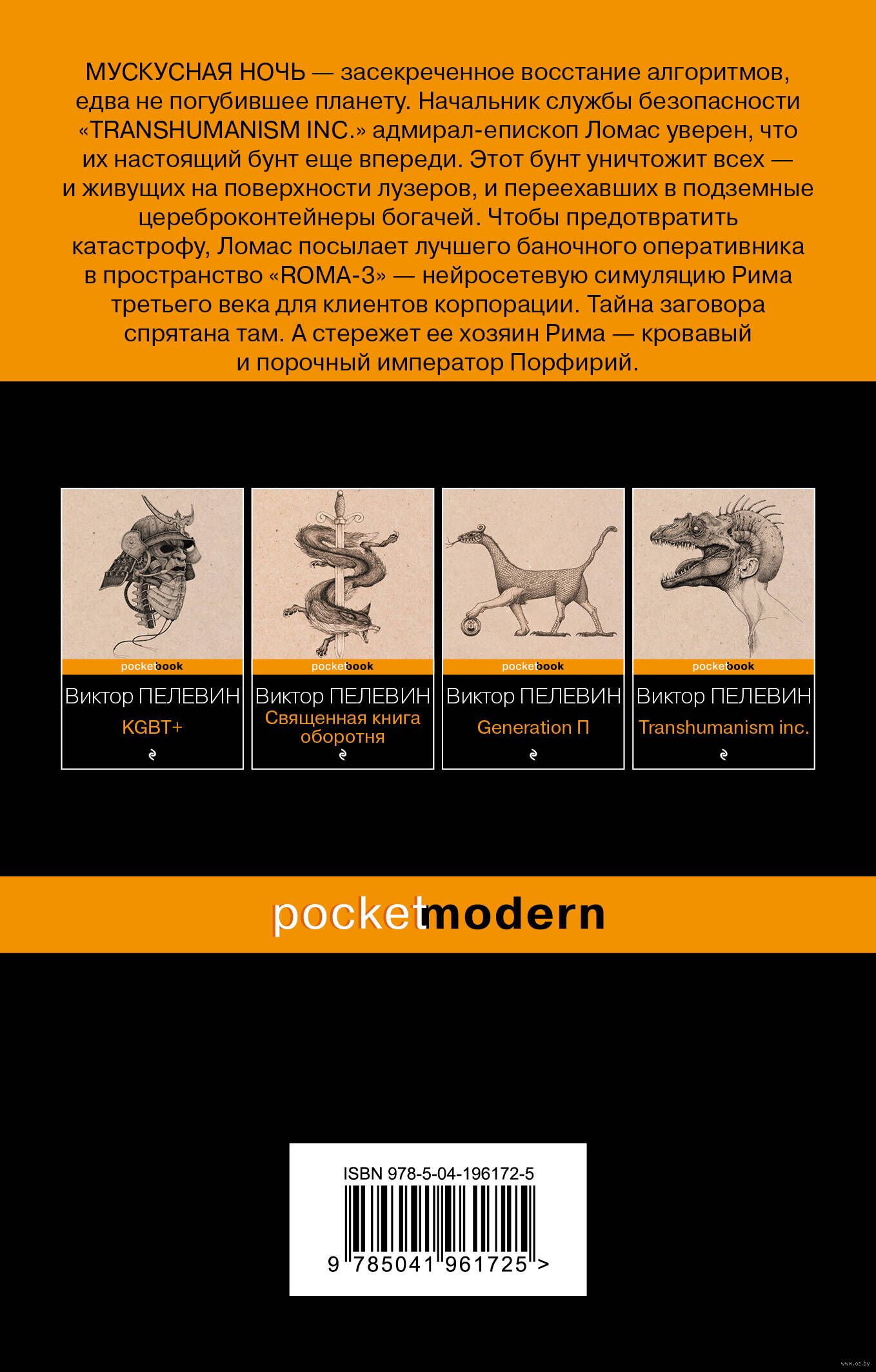 "МУСКУСНАЯ НОЧЬ" – засекреченное восстание алгоритмов, едва не погубившее планету. Начальник службы безопасности "Transhumanism Inc." адмирал-епископ Ломас уверен, что их настоящий бунт еще впереди. Этот бунт уничтожит всех – и живущих на поверхности лузеров, и переехавших в подземные цереброконтейнеры богачей. Чтобы предотвратить катастрофу, Ломас посылает лучшего баночного оперативника в пространство "ROMA-3" – нейросетевую симуляцию Рима третьего века для клиентов корпорации. Тайна заговора спрятана там. А стережет ее хозяин Рима – кровавый и порочный император Порфирий.