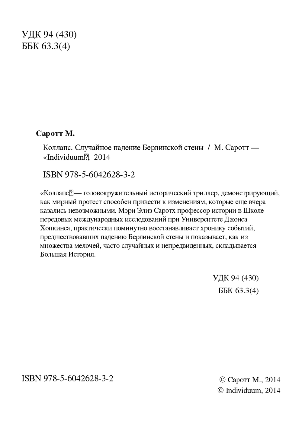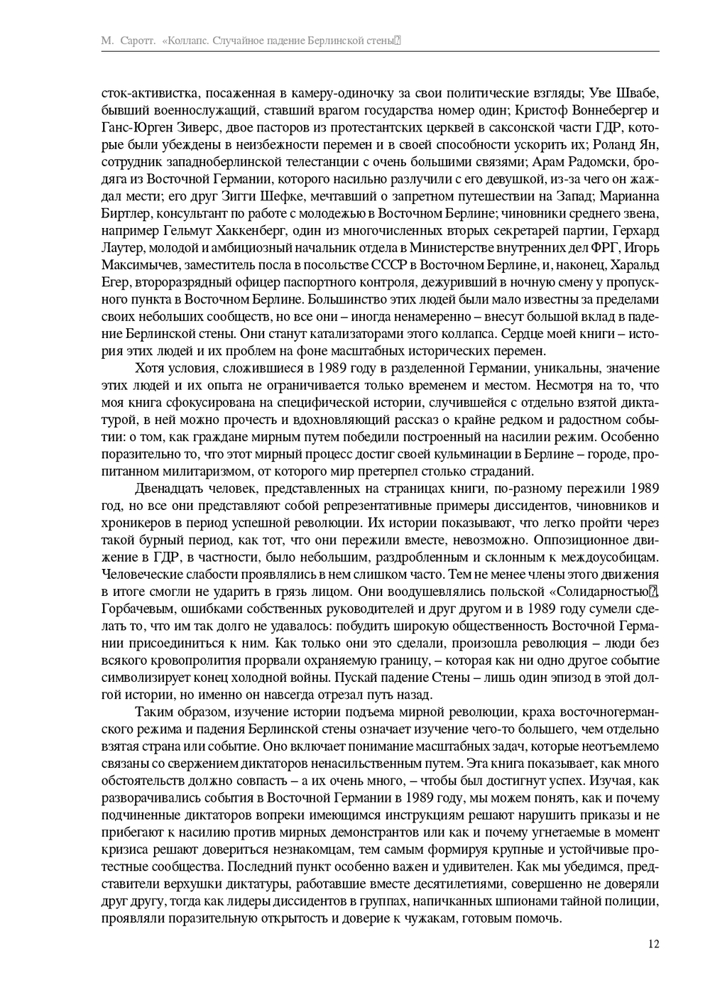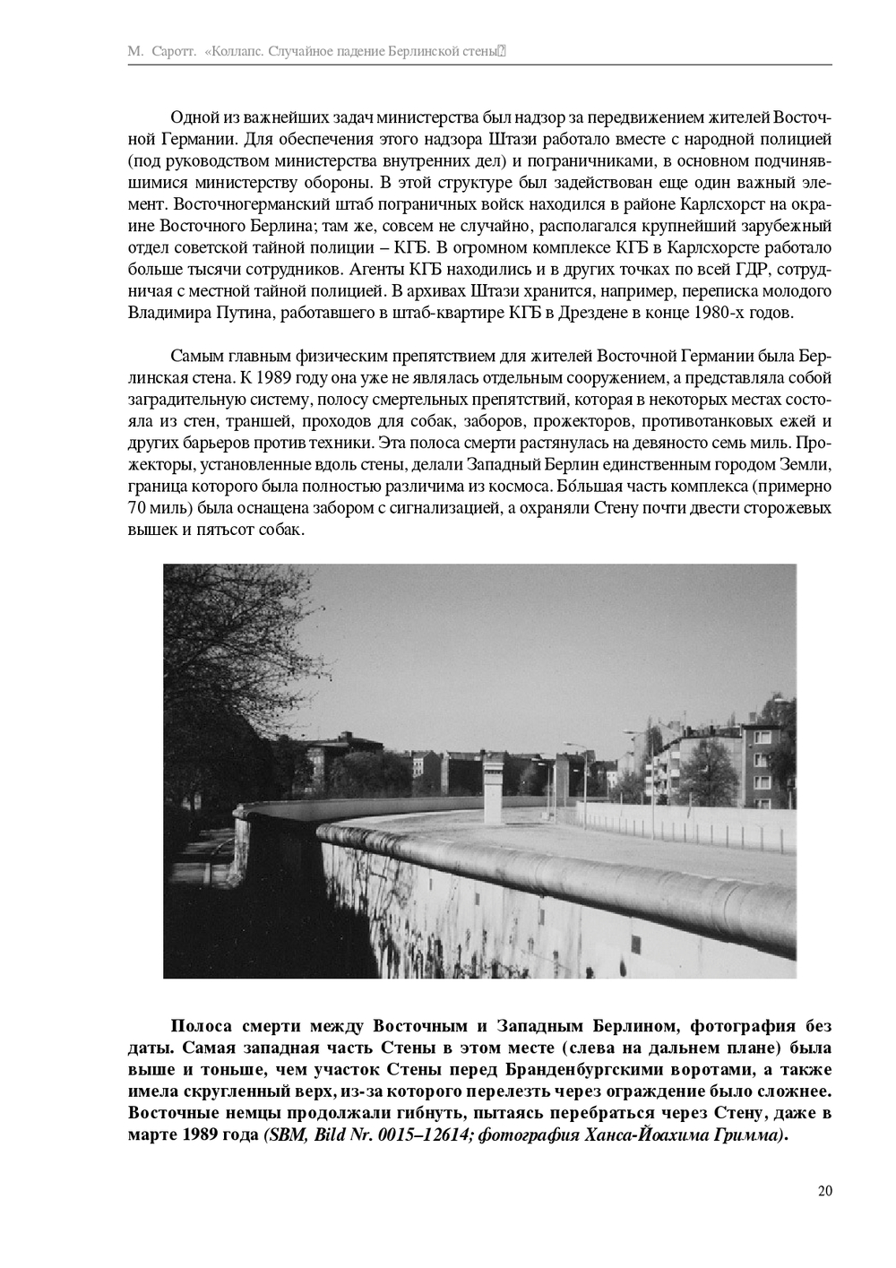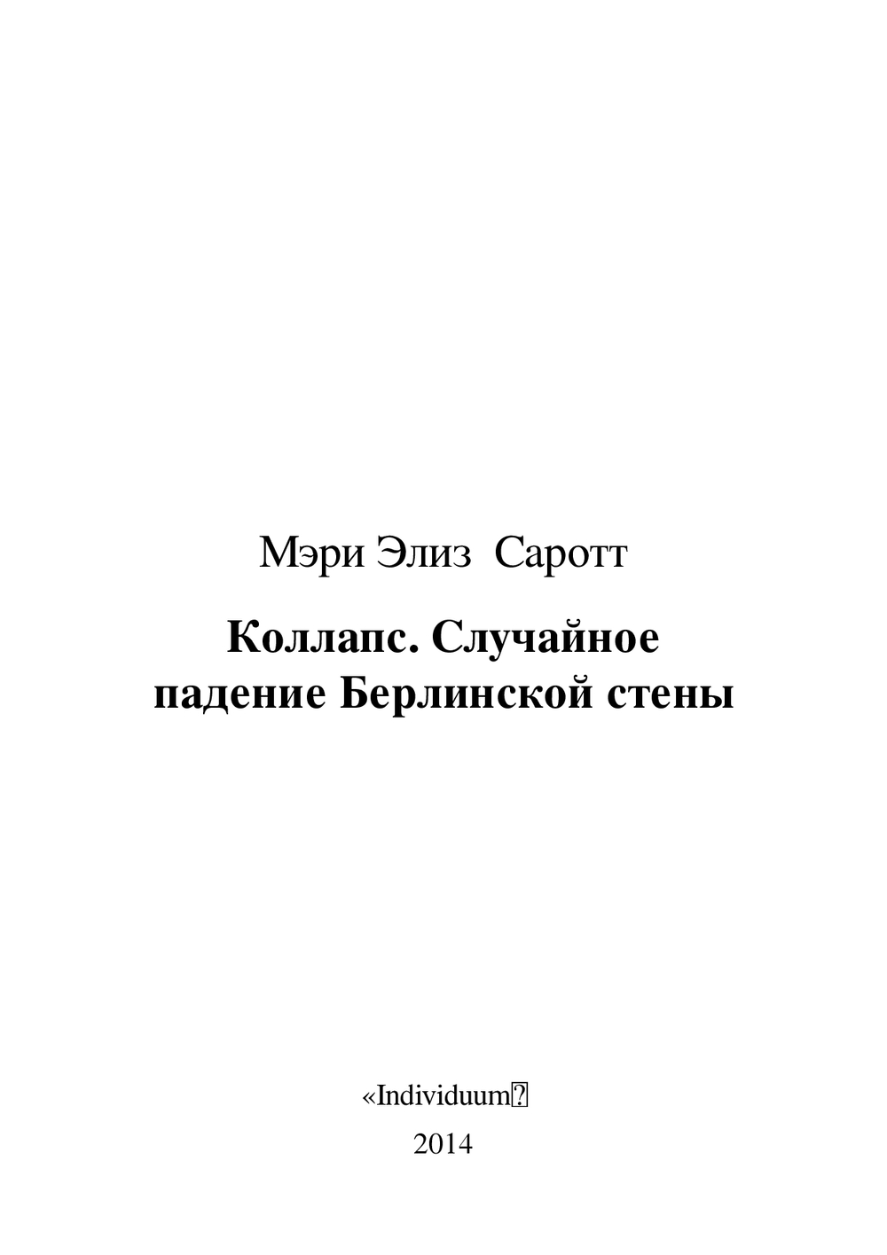 Мэри Элиз Саротт, профессор истории в Школе передовых международных исследований при Университете Джонса Хопкинса, практически поминутно восстанавливает хронику событий, предшествовавших падению Берлинской стены, и показывает, как из множества мелочей, часто случайных и непредвиденных, складывается Большая История.