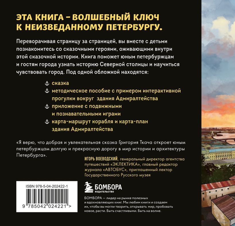 В этой увлекательной и красочной книге вы найдете ключик, который откроет вам двери в неизведанный Петербург. Переворачивая страницу за страницей, вы вместе с детьми познакомитесь со сказочными героями, которые впоследствии встретятся вам во время прогулки вокруг здания Адмиралтейства.