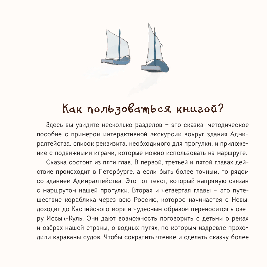 Также внутри вы найдете две красочные карты. Карту-план со зданием Адмиралтейства можно отсканировать и превратить в пазл, который вы будете собирать в процессе прохождения маршрута. На ней герои сказки, изображенные на фасадах здания Адмиралтейства, ожили и сошли со своих мест, чтобы повстречаться с маленькими читателями. А также в книге есть карта европейской части России. По ней можно не только проследить маршрут кораблика, но и использовать ее как игру-ходилку. Главное, чтобы у вас были при себе кубик и фишки.