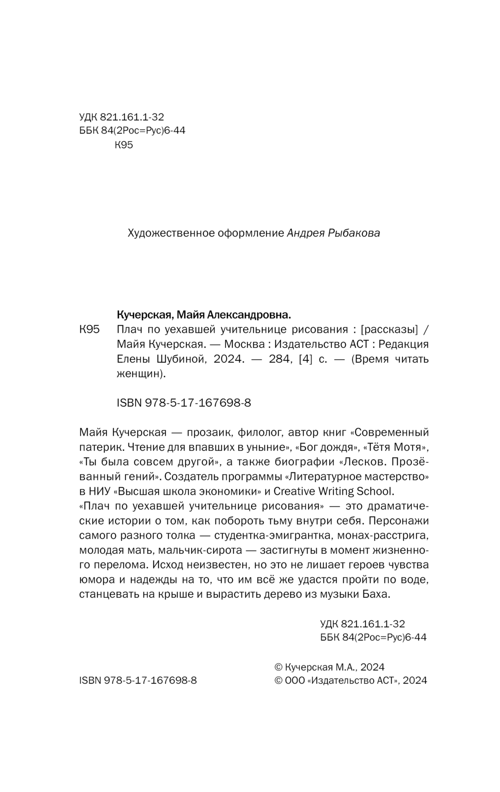 "Плач по уехавшей учительнице рисования" – это драматические истории о том, как побороть тьму внутри себя. Персонажи самого разного толка – студентка-эмигрантка, монах-расстрига, молодая мать, мальчик-сирота – застигнуты в момент жизненного перелома. Исход неизвестен, но это не лишает героев чувства юмора и надежды на то, что им всё же удастся пройти по воде, станцевать на крыше и вырастить дерево из музыки Баха.